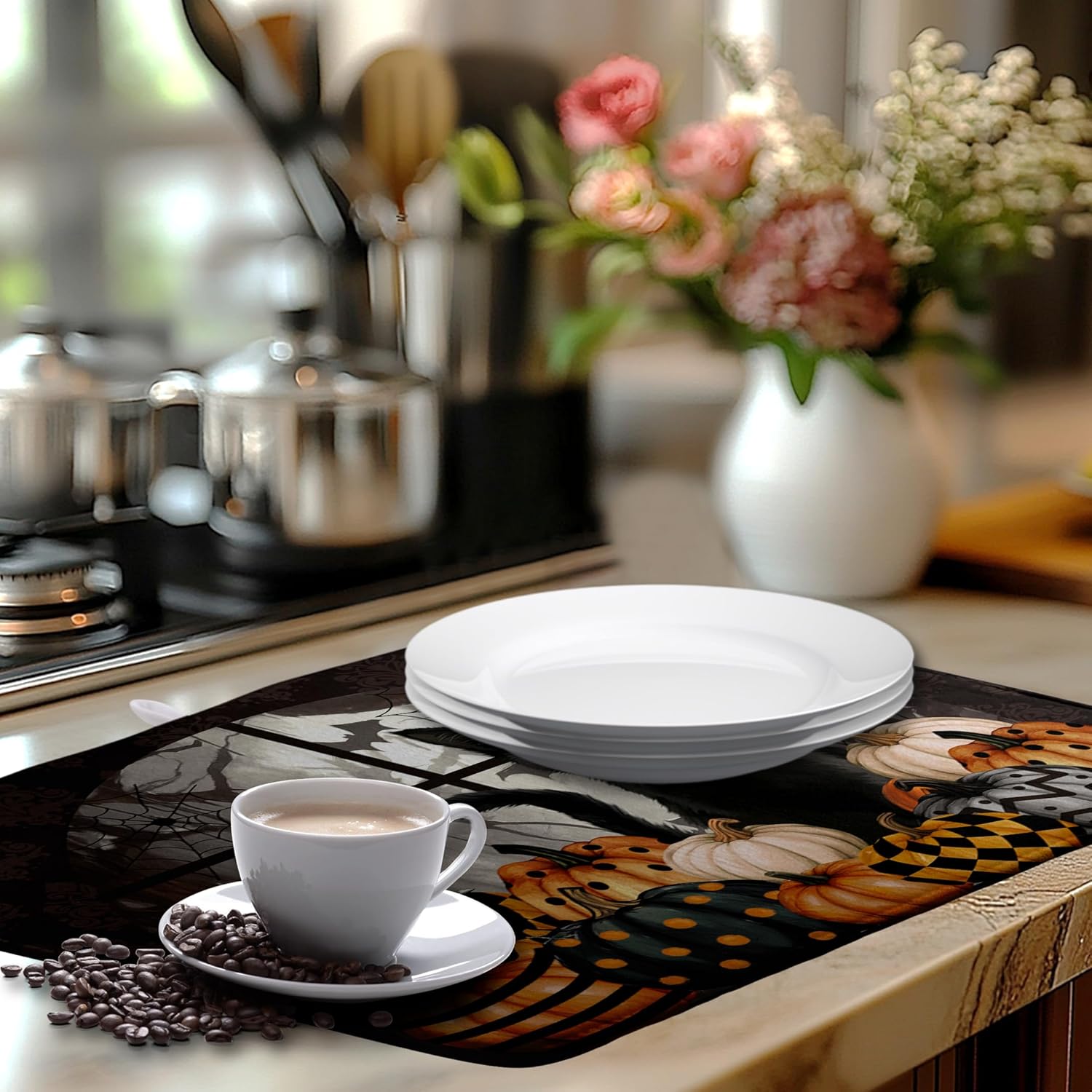 - [Material]: The surface of this Fall Halloween Pumpkins kitchen drying mat is made of absorbent microfiber and the middle is made of composite sponge. Maple Leaf Black Bat Large microfiber dish drying mat can be easily rolled up and folded for storage or hanging.
