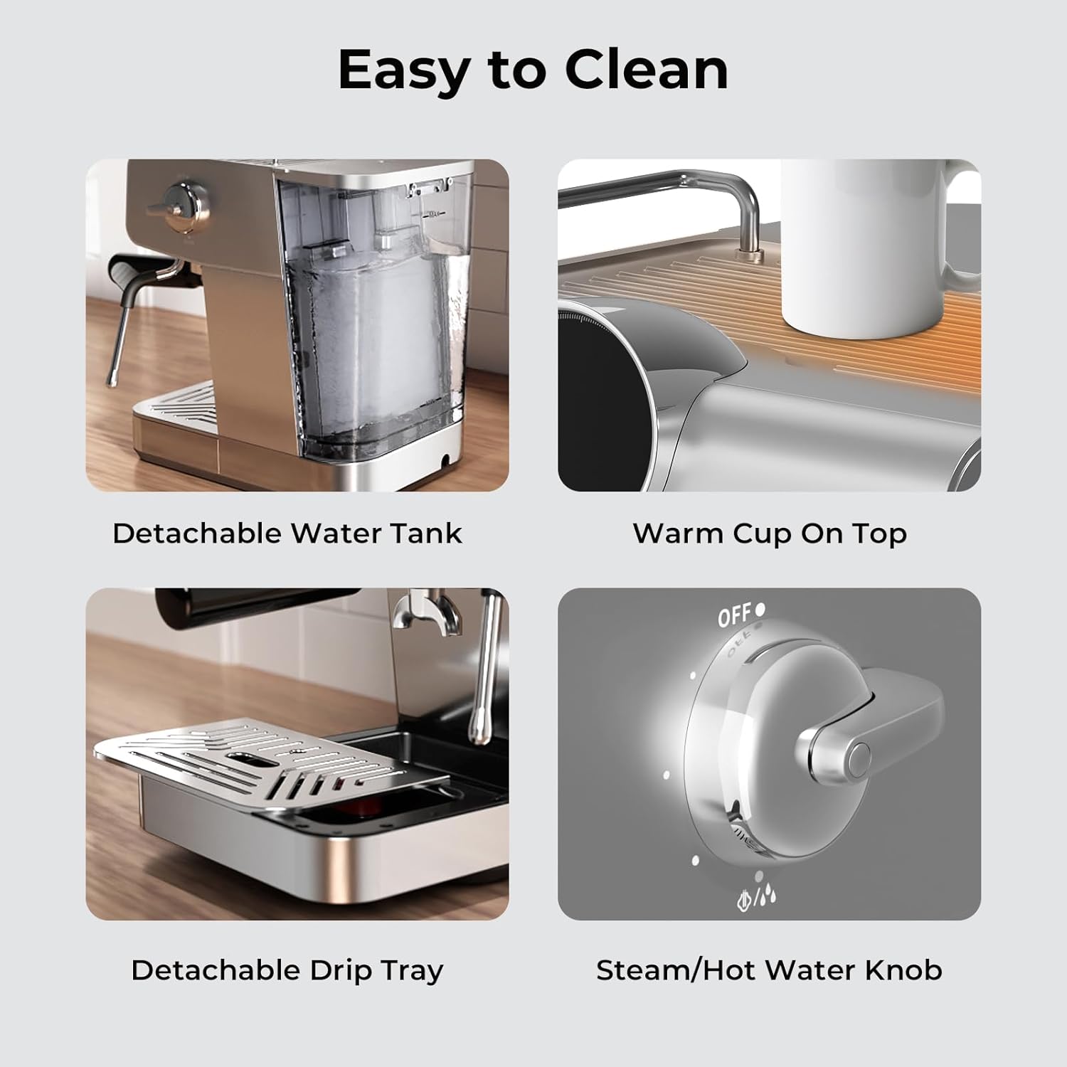 - Professional 20-Bar Pressure System:This espresso machine comes with 20 bar professional pump and 1350 W powerful boiler, coupled with a quick heating system.High-pressure extraction can better release the aroma of coffee, increase oil and shorten the extraction time, and you can quickly get a cup of high-quality espresso even in a hurry