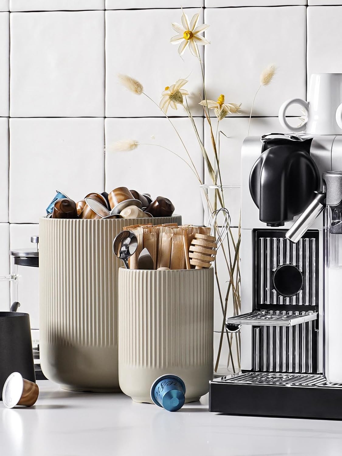 LE TAUCI Utensil Holder, 7.3"+5.4" Ceramic Kitchen Utensil Holder for Countertop, Large Cooking Utensil Crocks for Kitchen Counter, Morden Utensil Organizer for Spatula, Set of 2, Oatmeal Greige