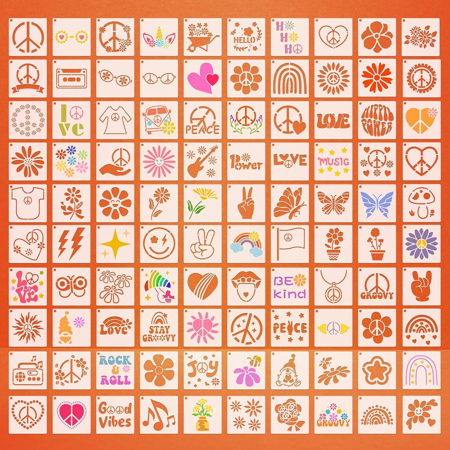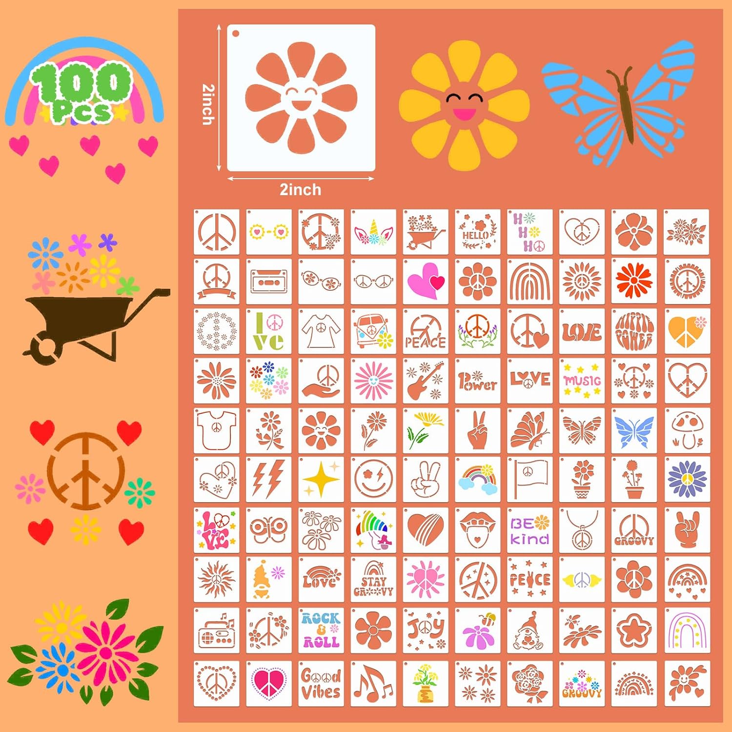 Fainne 100 Pcs Stencils for Painting on Wood Reusable Stencil Crafts Drawing Templates Holiday Wall Paper for DIY Scrapbook Home 2 x 2 Inch (Groovy Party)