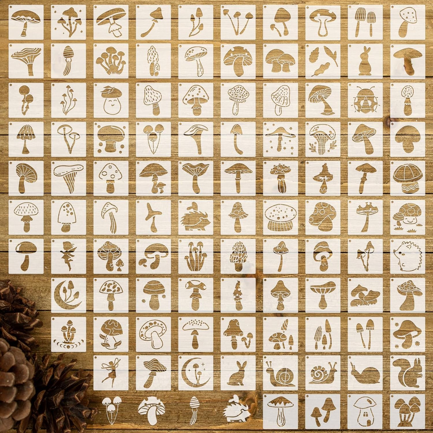 Fainne 100 Pcs Stencils for Painting on Wood Reusable Stencil Crafts Drawing Templates Holiday Wall Paper for DIY Scrapbook Home 2 x 2 Inch(Mushroom)