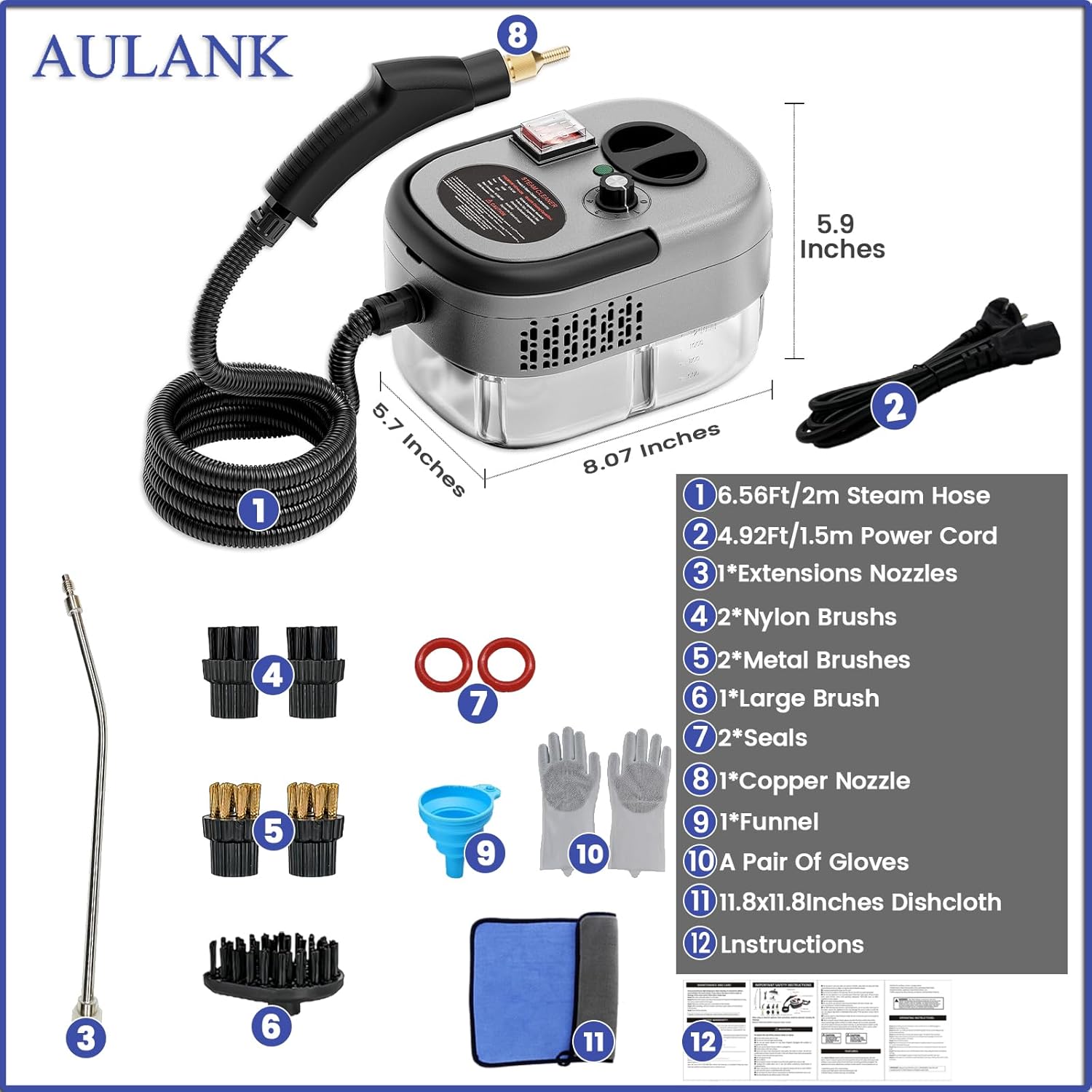 - 【Attachments & Service】 You can get: 1 x steam cleaner machine with tank, 1 x 2m steam pipe, 1 x 1.5m power cord, 1 x Extended Sprayer Rod, 2 x cooper brush, 2 x nylon brush, 1 x big nylon brush,1x towel,1xfunnel, 1 x Glove, 2 x waterproof gasket and 1 x user manual. Meanwhile, if you find any parts are damaged after receiving a product or you have other questions, please feel free to contact with us and we will get back to you within 24 hours.