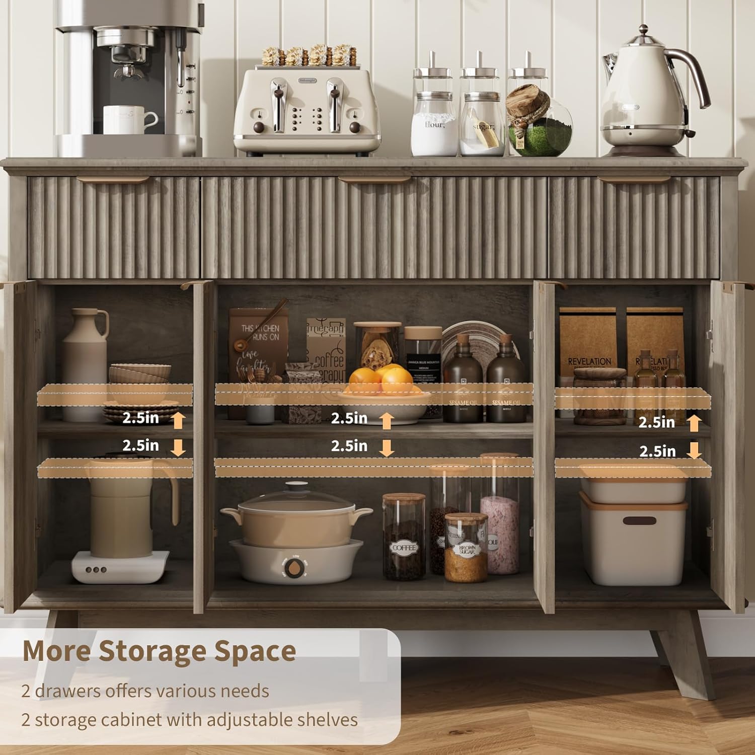 QUW Fluted Sideboard Buffet Cabinet with Charging Station, 47.2" Kitchen Storage Cabinet with Drawers and Adjustable Shelves, Modern Coffee Bar Kitchen Table for Dining Room, Living Room, Grey