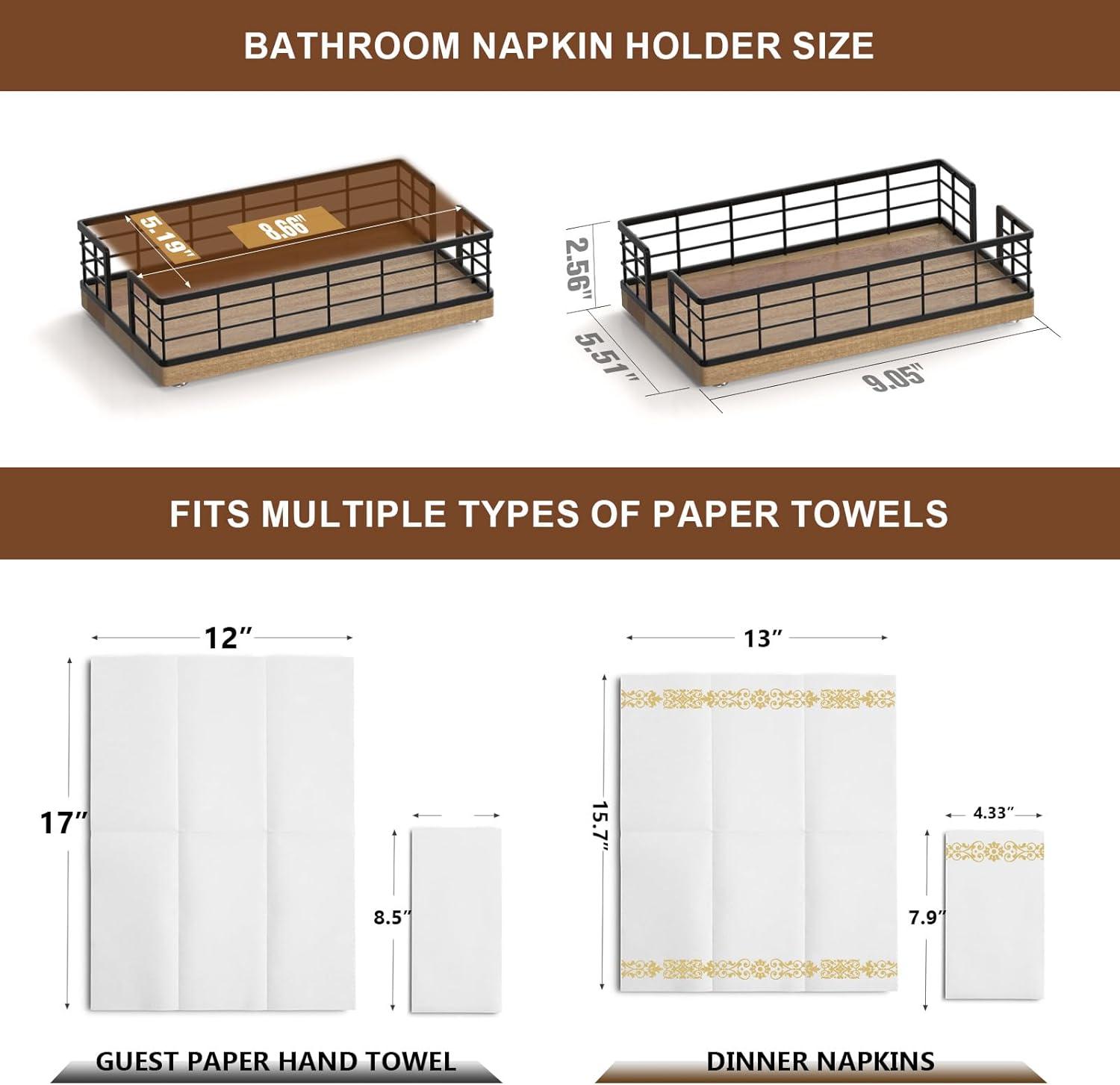 Wican Guest Towel Holder Tray for Bathroom, Acacia and Iron Napkins Holder for Powder Room Dinning Table Wooden Basket for Disposable Paper Hand Towels Black and Acacia