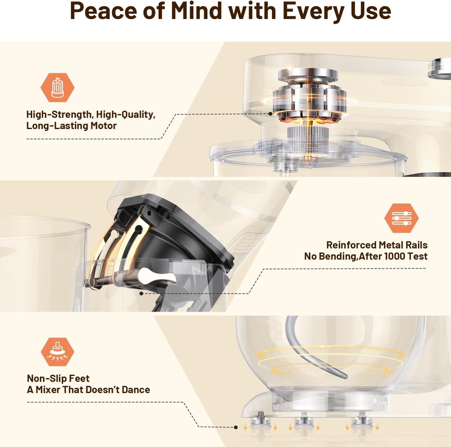 - 【More Power, Less Noise】 Equipped with a high-performance 660W pure copper motor for 50% more power, this model easily handles dough, cream, and other tough ingredients. As one of the most reliable household stand mixers, it features 360° planetary mixing action and advanced overheat protection for up to 30 minutes of continuous operation. The triple noise-reduction design with strong suction cups lowers noise by 20%, giving you a professional-grade quiet experience.