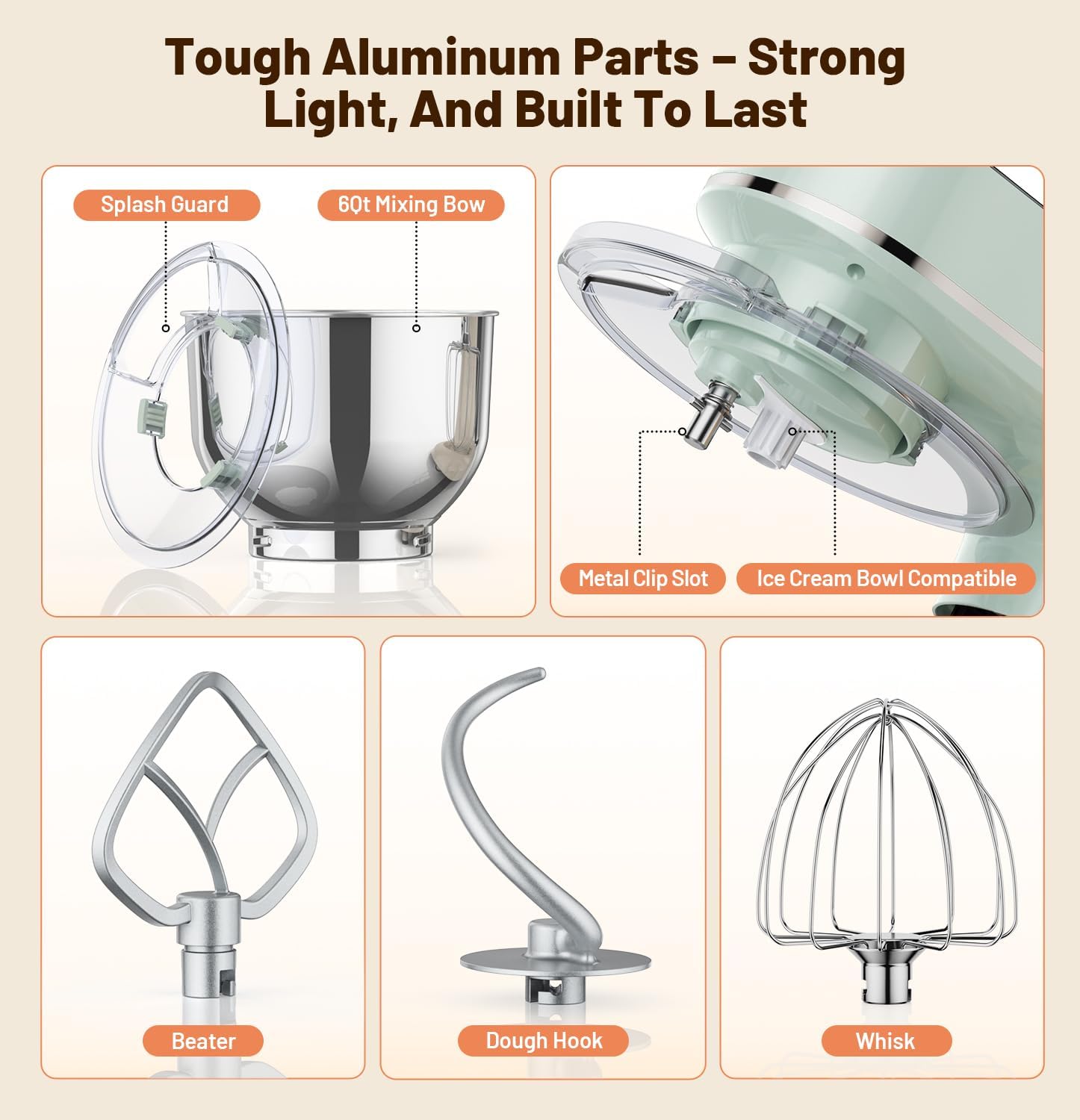 - 【All-in-one accessory set】Our electric mixer's dough hook, stirrer and whisk are made of lightweight, durable aircraft-grade aluminum that's 40% lighter and dishwasher safe. With an innovative design featuring a removable baffle and wide-opening inlet for easy addition of ingredients during operation, this powerful kitchen helper will reliably meet all of your baking needs and is built to last.