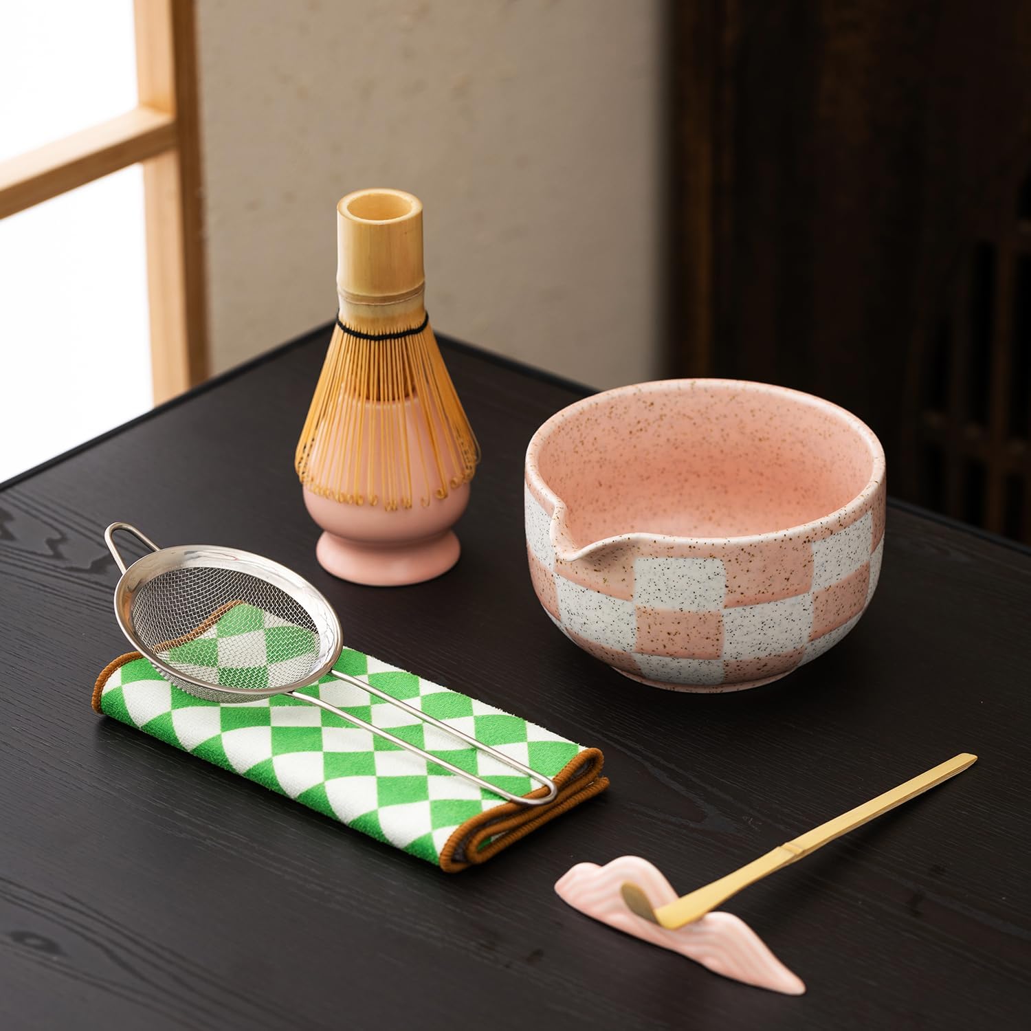 Premium 7-Piece Matcha Tea Set – Traditional Japanese Style with Elegant Grid Pattern, Includes Bamboo Whisk, Ceramic Bowl, Scoop & More – Perfect for Matcha Lovers & Tea Ceremony (Pink grid)