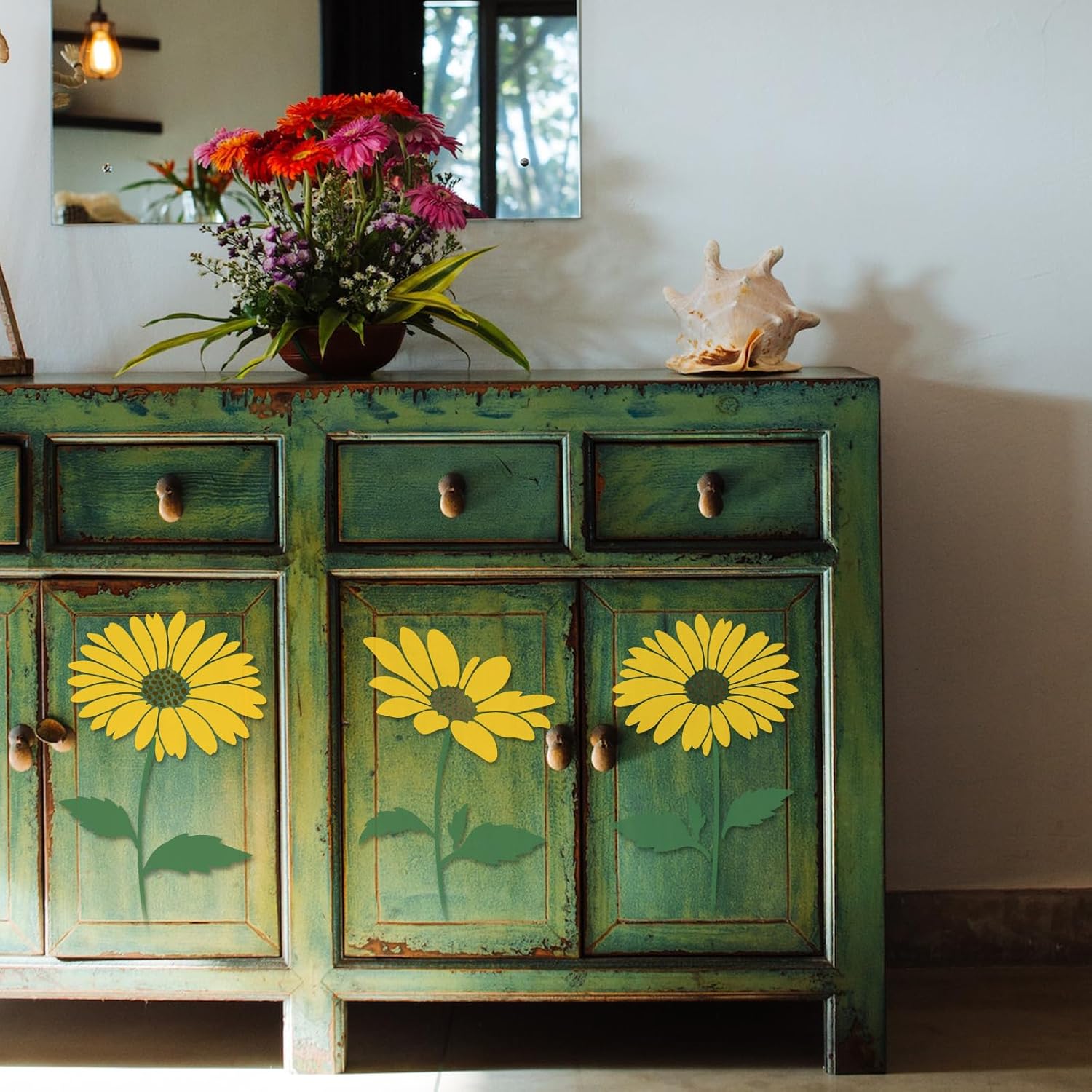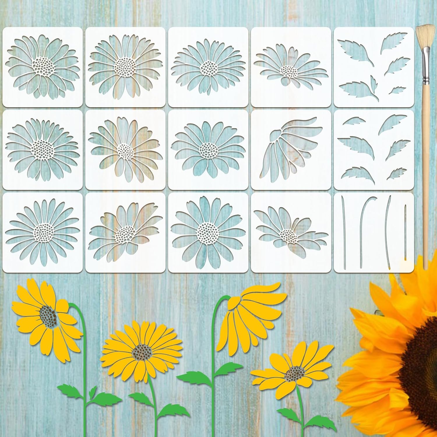 15PCS Large Flower Stencils for Wood Fence 12 x 12 Inch Sunflower Stencil with Brushes Reusable Floral Wall Stencil Sunflower Stencils for Painting on Walls Furniture Garden Fabrics