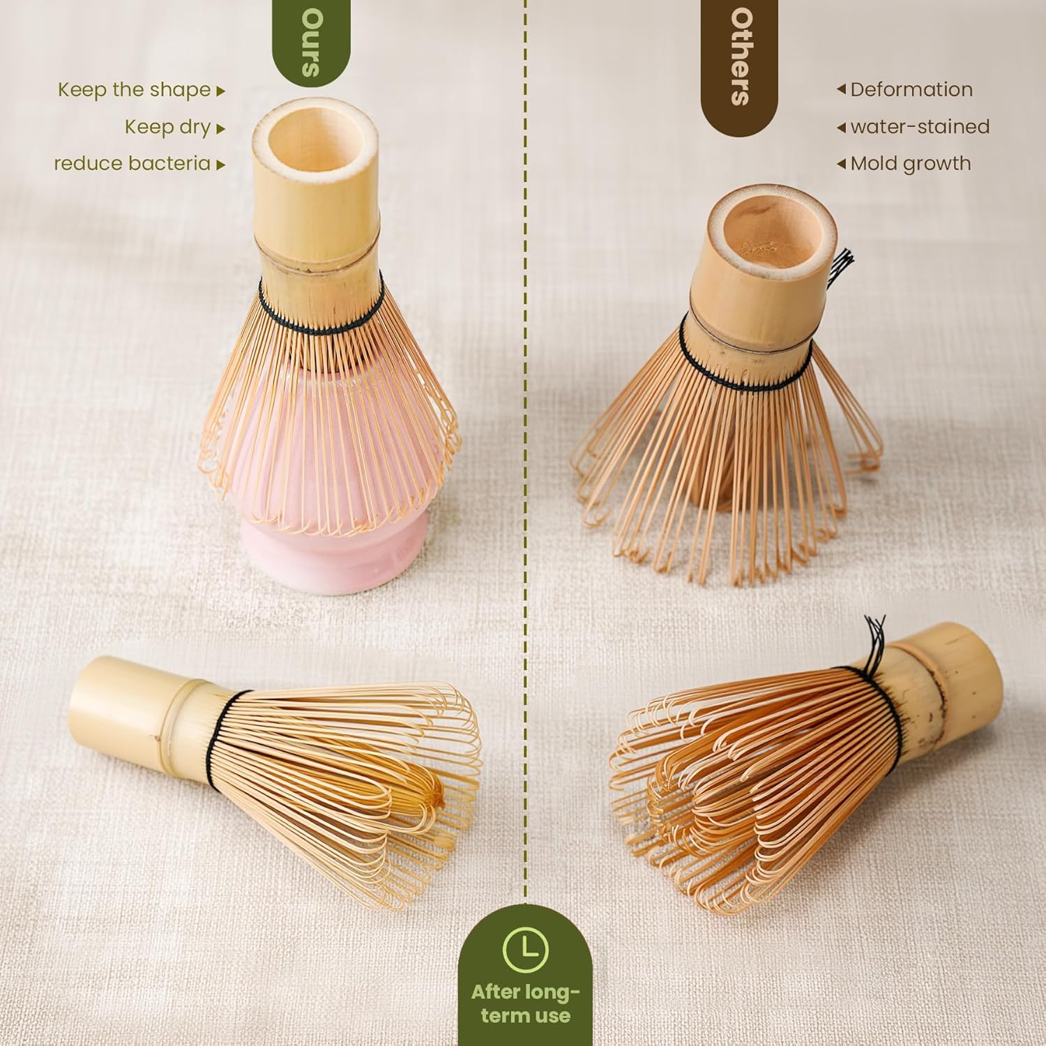 - 【Warm Tips 2】Here’s how to prevent bamboo splitting in our matcha whisk set and ensure long-lasting quality for our customers: ① Soak in 60℃ water for 90s before first use (no soap needed, no hot water), and air-dry upside down. ② Monthly rub food-grade mineral oil (or coconut/camellia oil) into bamboo grain. ③ Keep in dry area away from heat sources (steamers/sunny windows = bamboo's enemy!). As bamboo whisks are consumables, we recommend replacing every 3-6 months.