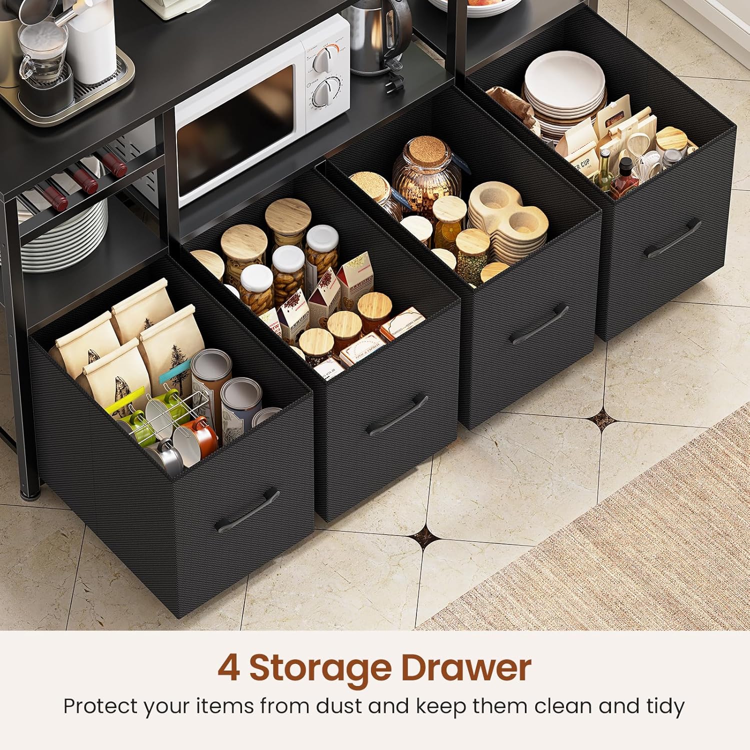 - 【Premium Storage Space】Our bakers rack has 2 clear acrylic cabinets on the top and 4 large fabric drawers on the bottom, providing plenty of individual storage space, which not only keeps your items clean and prevents the accumulation of dust, but also keeps the space neat and tidy.