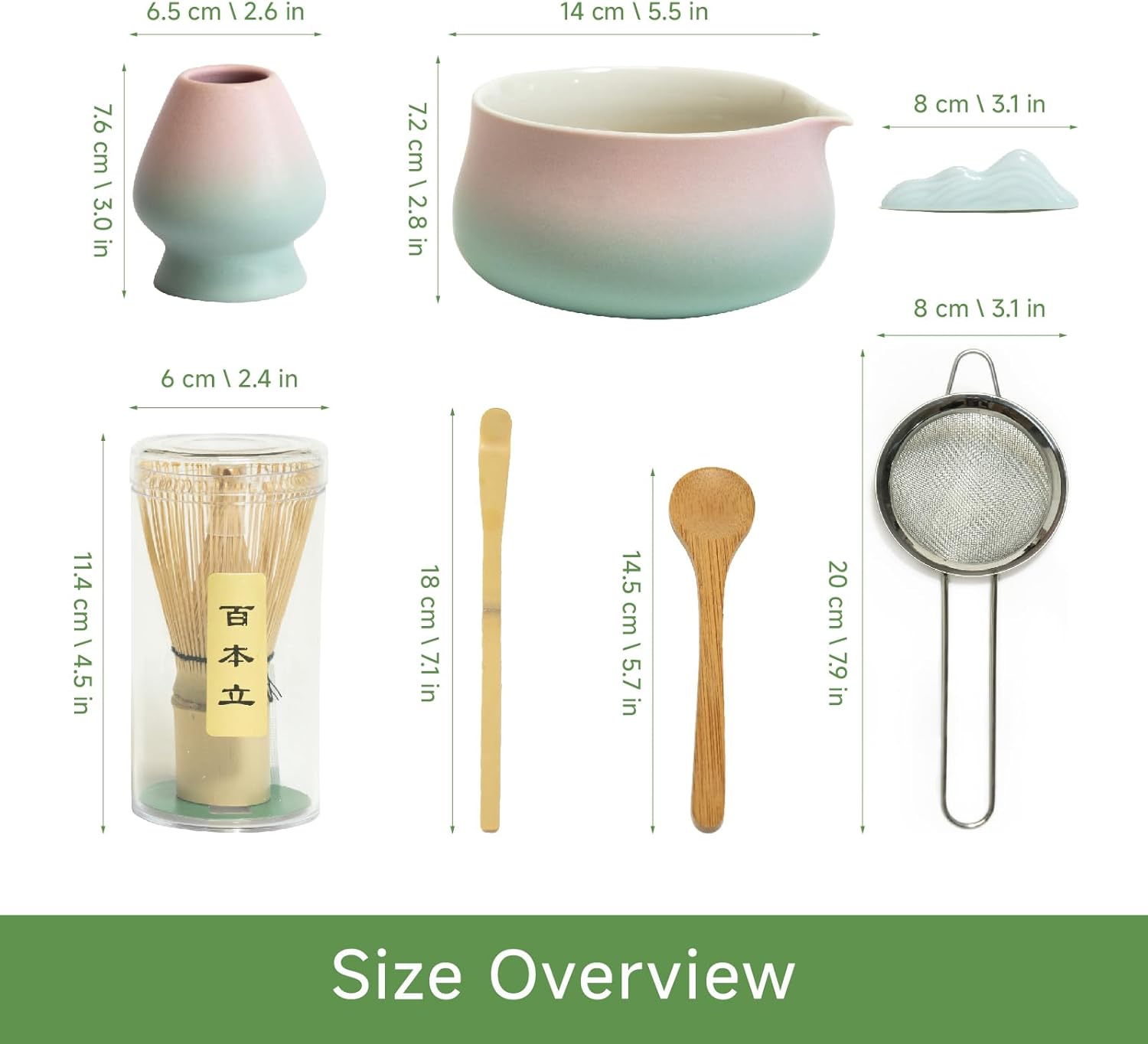 - All-in-One Matcha Whisk Set for Home or Ceremony- This 7-piece matcha set includes a handcrafted matcha bowl with spout, 100-prong bamboo matcha whisk (chasen), ceramic whisk holder, bamboo scoop (chashaku), scoop rest, and stainless steel matcha sifter. Ideal for beginners or experts seeking a complete matcha kit for authentic tea preparation.