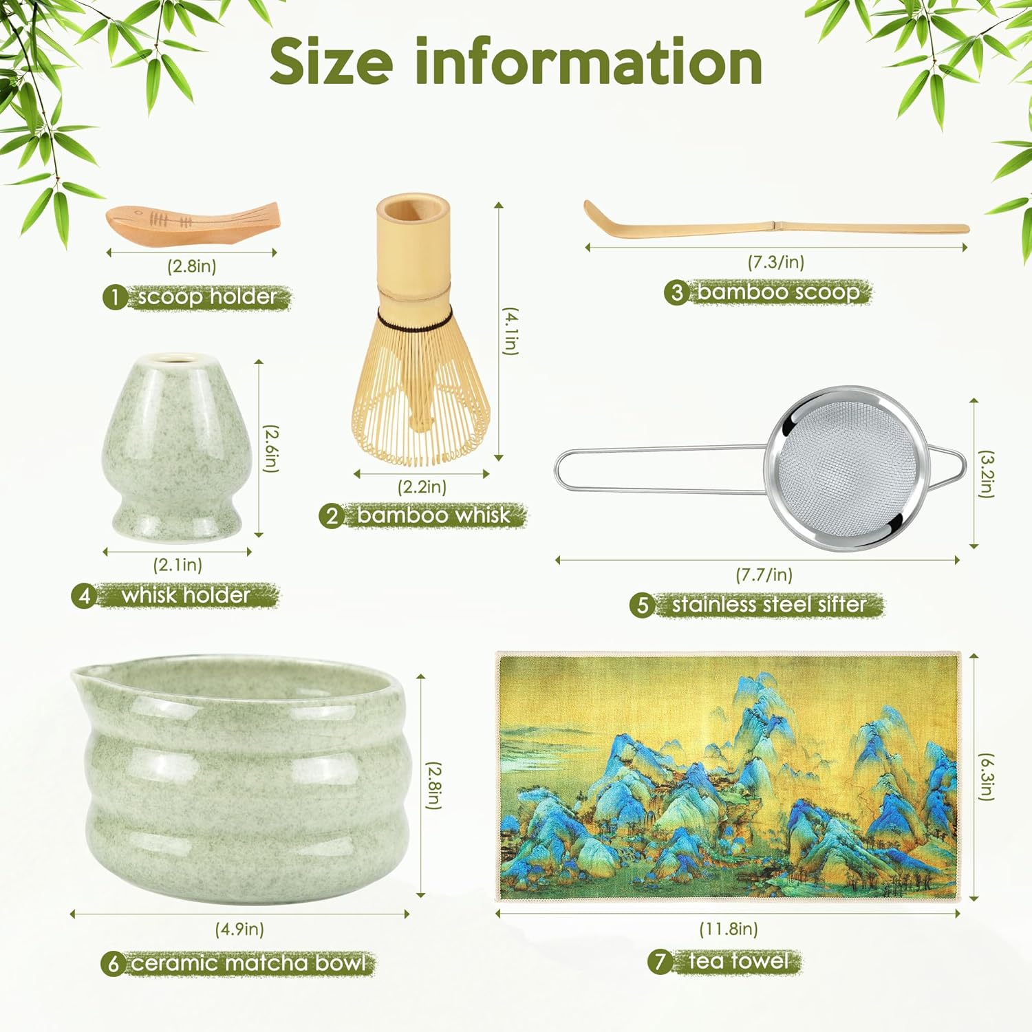 - Complete 7-Piece Matcha Whisk Kit: Elevate your matcha ritual with this all-inclusive set for both beginners and connoisseurs. Includes 1* ceramic matcha bowl with a convenient pouring spout, 1* traditional bamboo whisk and 1* whisk holder, 1* bamboo scoop and holder, 1* fine stainless steel sifter, and 1* beautiful tea towel. This carefully curated kit provides everything you need to create a frothy cup of matcha every time.