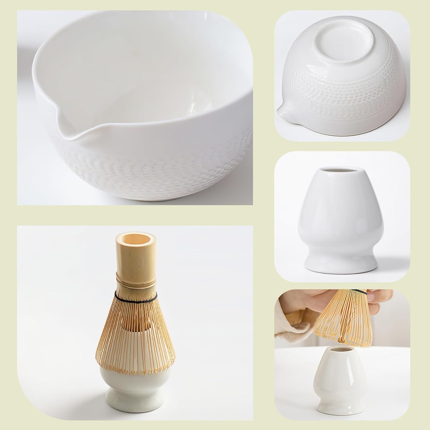 - Matcha Set: Our matcha whisk set meets all your needs for making matcha, including a ceramic matcha bowl, a bamboo matcha whisk, a stainless steel sifter, a bamboo scoop, and a matcha whisk holder. Each accessory is meticulously designed and crafted, perfectly blending traditional and modern styles, allowing you to experience a relaxed and fashionable matcha lifestyle.