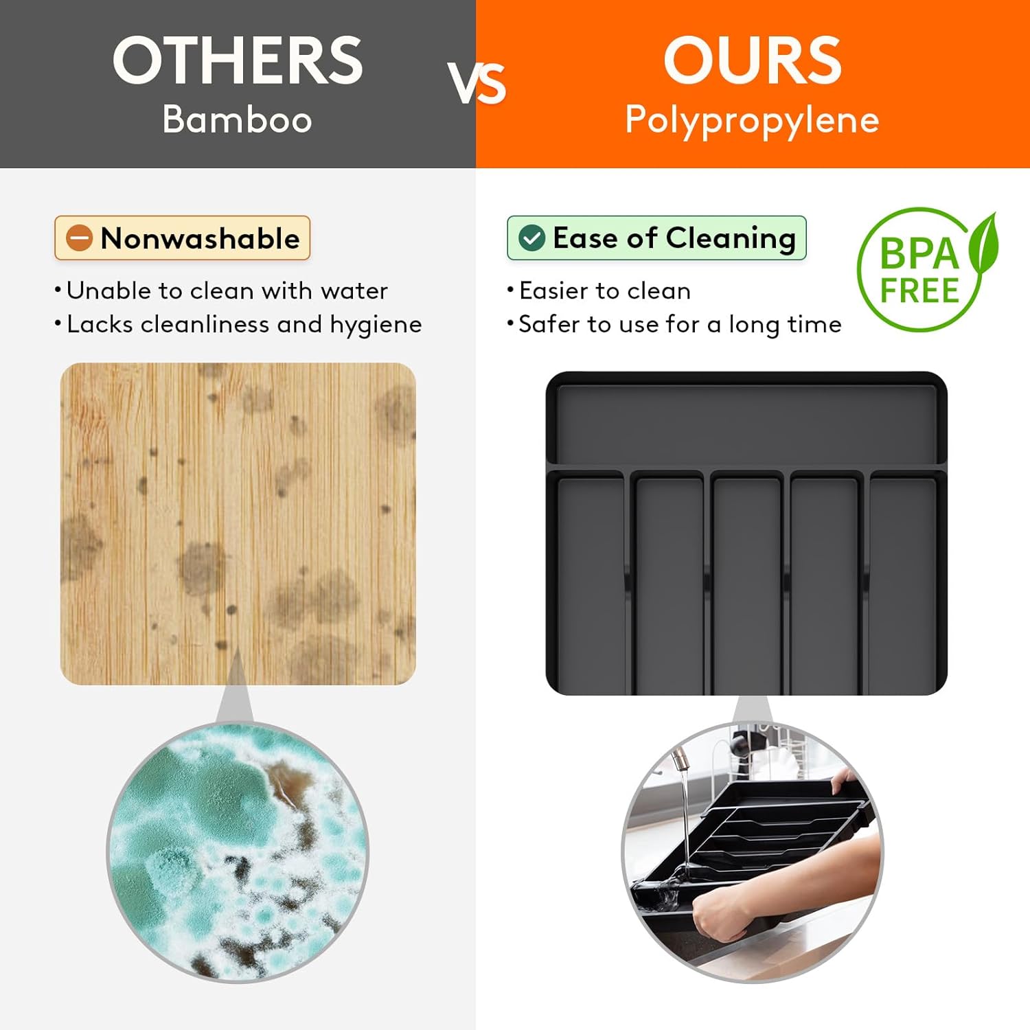 - Robust and Safe: This kitchen drawer organizer is crafted from premium PP material, BPA-free and built to last. It ensures your silverware is stored in a healthy, safe environment for worry-free use