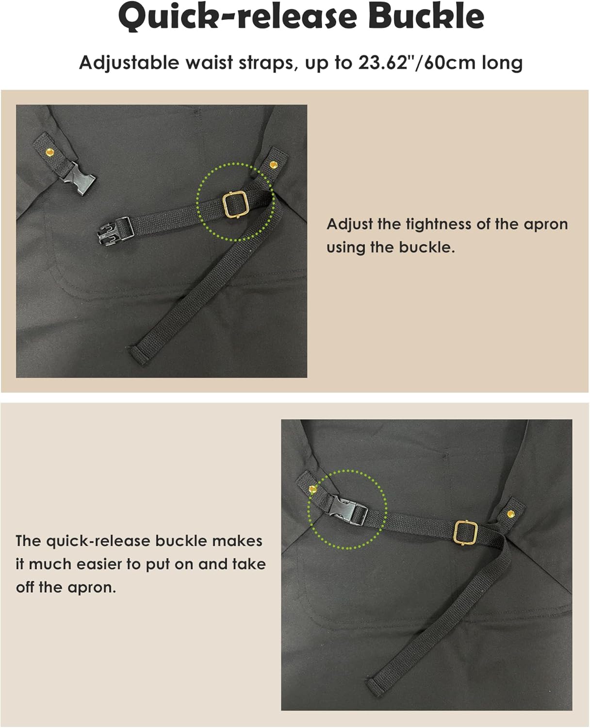 • Quick-release Buckle: Adjustable waist straps, up to 23.6"/60cm long; Quick-release buckle design for easy on and off