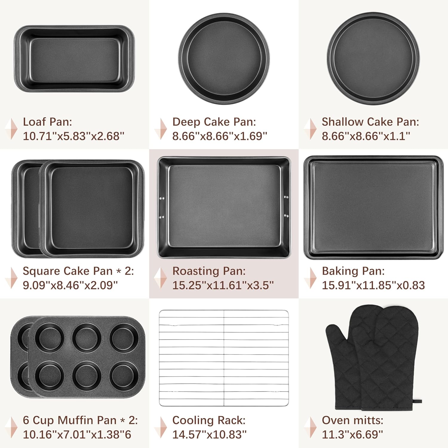- [All In One Set] Ideal for baking, roasting, and beyond, this 12-piece bakeware set makes a perfect starter kit for novice bakers. It includes 1 roasting pan(15.3*11.6*3.5 IN), 1 baking sheet(15.9*11.9*0.8 IN), 1 loaf pan(10.7*5.8*2.7 IN), 2 square cake pans(9.2*8.5*2.1 IN), 1 deep cake pan(8.7*8.7*1.7 IN), 1 shallow cake pan(8.7*8.7*1.1 IN), and 1 cooling rack(14.6*10.9 IN), two 6-cup muffin pans(10.2*7.0*1.4 IN) and a pair of cotton oven mitts. It can meeting all your baking needs