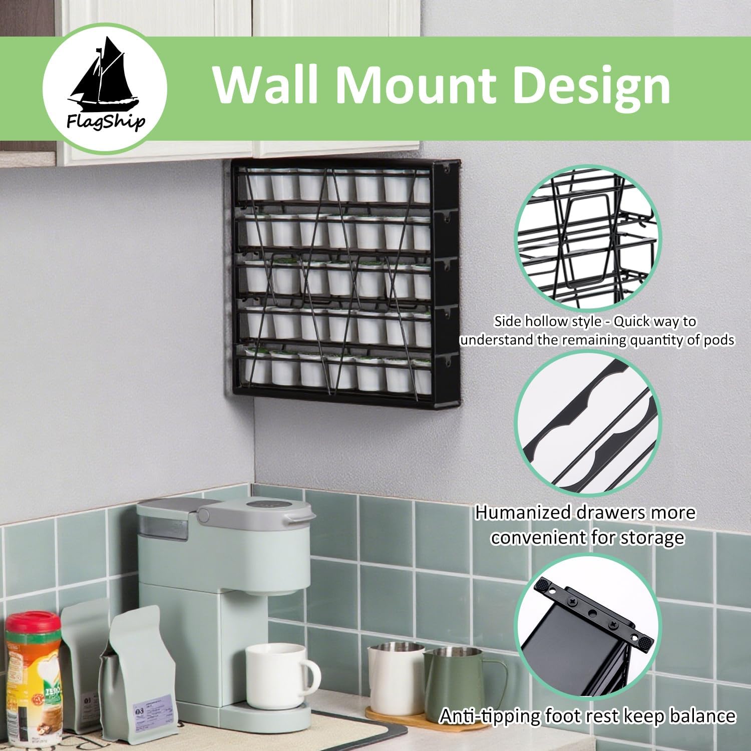 - 【Space Efficiency Pro】Tame your coffee pod chaos! This 5-tier (14.4"Lx13.6"H) black metal warrior stores 35 K cup pods in less space than a toaster. Wall-mountable design frees up countertops – perfect for cramped kitchens or office nooks. Your personal caffeine inventory system!