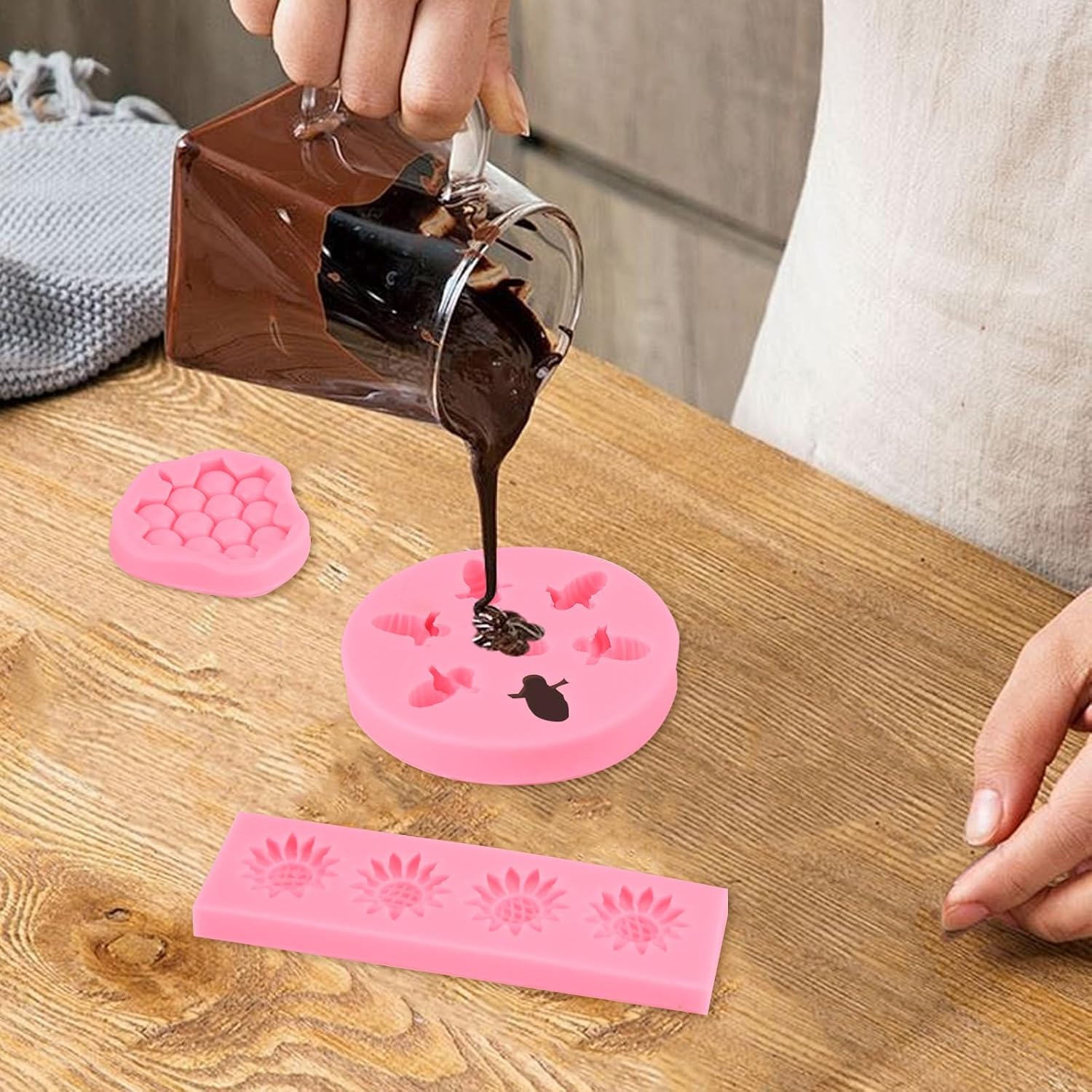 4 Pcs Bumble Bee Silicone Molds Kit with Honeycomb, Bee and Sunflower, Fondant, Chocolate, Cupcake, Cake Decorating, Candy Molds(Pink)