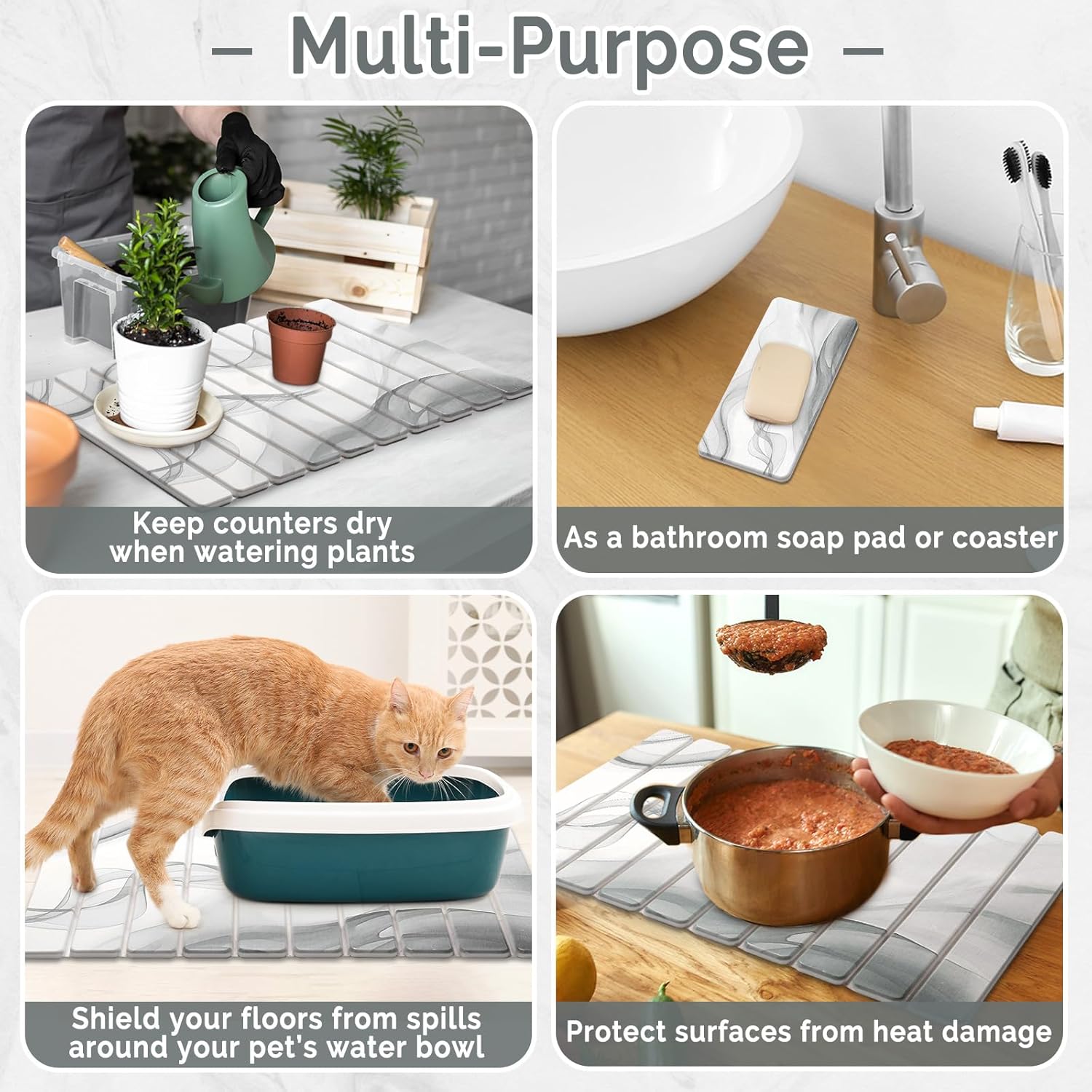 - 【Wide application】Collapsible stone dish drying mat helps maintain a clean kitchen, ensuring your surfaces stay neat and fresh. The large stone drying mat acts also as a heat-resistant mat, protecting countertops from hot pots and pans. kitchen drying mat also doubles as a bath mat, plant saucer, or pet feeding mat, offering flexibility for various home uses.