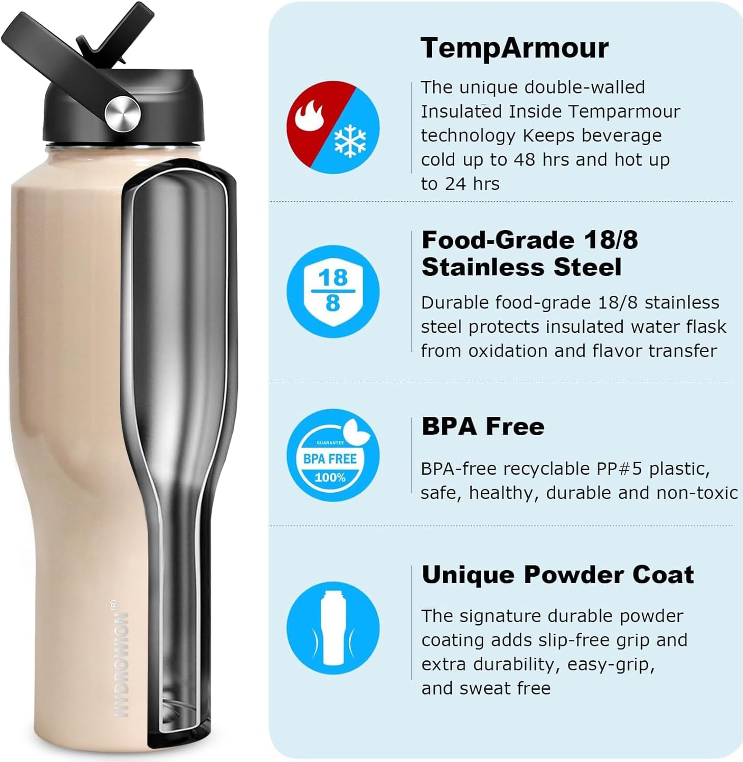 - 【VACUUM INSULATED】 Unique technology inside HYDROWION 40oz water bottle keeps cold drink icy for up to 48 hours and hot beverage steaming up to 24 hours, make sure your every sip is the feeling you want. Excellent leak proof sealing lid prevents leakage so that you can just grab and go