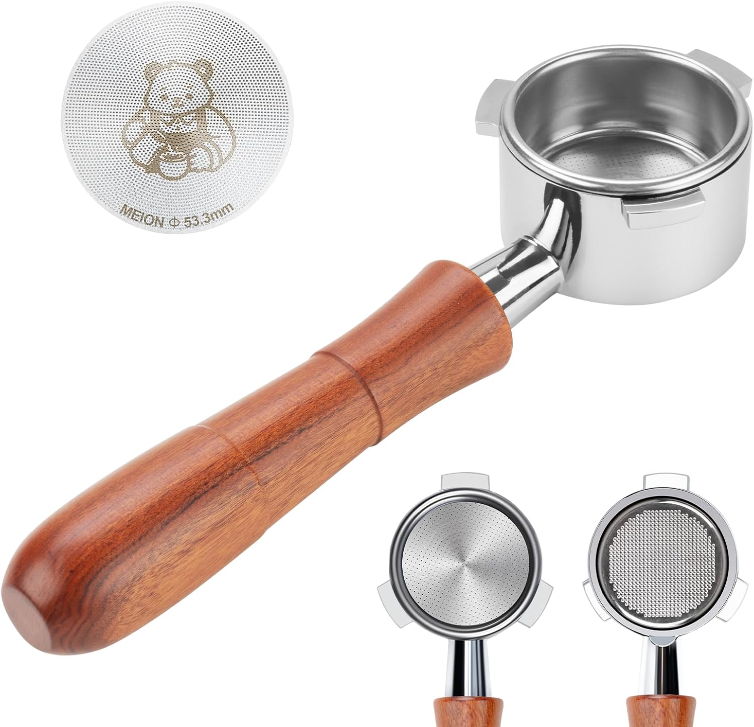 - 【Ergonomic Design】 Quaility Mahogany handle offers a non-slip grip and ergonomic comfort for precise tamping. The MEION bottomless portafilter is detachable and designed for quickly cleaning to enhance your brewing experience.