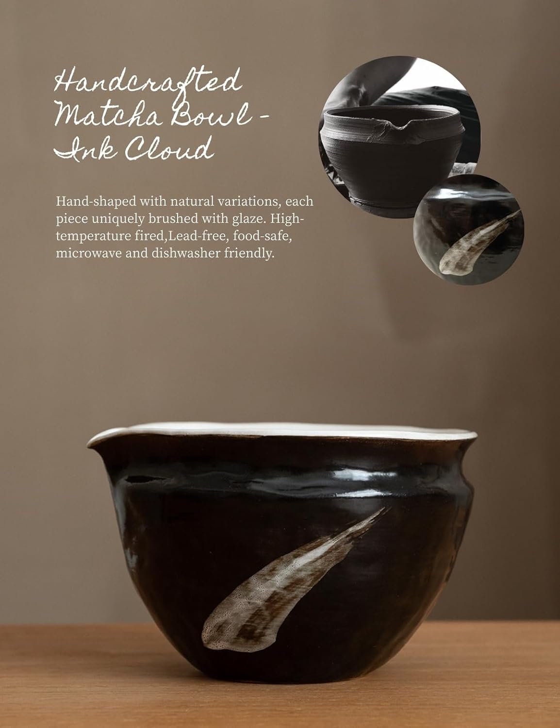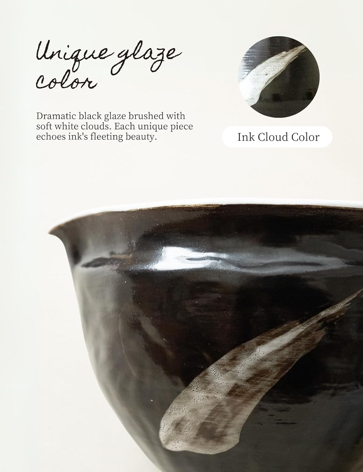 - Handcrafted Wabi-Sabi Bowl with Ink Cloud Hand-shaped with natural thickness variations, then brush-glazed stroke by stroke. Each product is unique.Featuring a smoothly glazed interior for easy cleaning High-temperature fired , food-safe, microwave-safe, and dishwasher-safe. Bold contrast, poetic charm — A dramatic black glaze with a soft white brush of cloud across the surface,echoing the fleeting beauty of ink in motion.