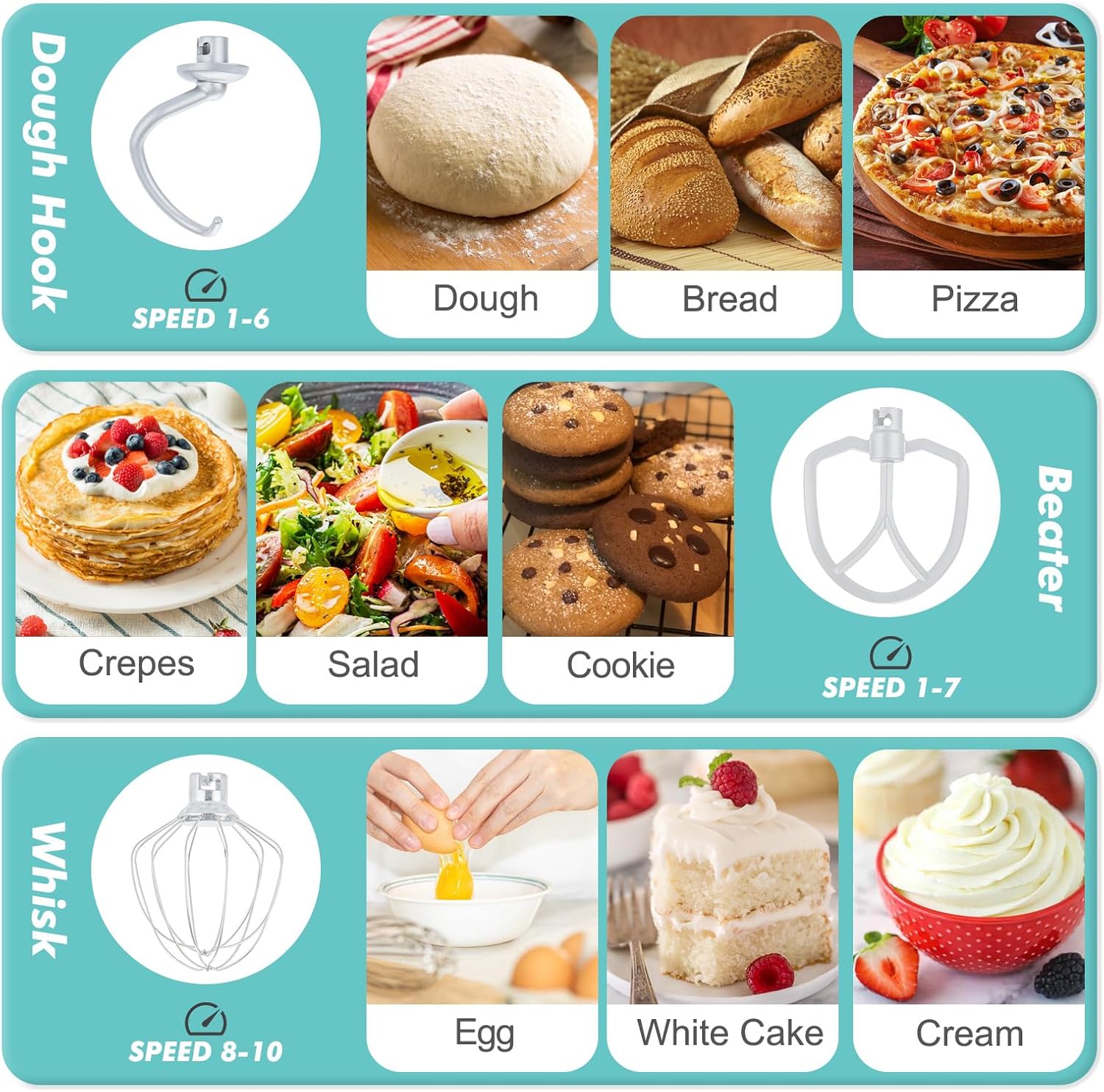 - 【Durable Attachments & Dishwasher Safe】As a versatile food mixer it includes coated aluminum dough hooks & beaters, plus a stainless steel whisk for lasting performance. All attachments snap on and off in seconds for quick changes during baking. The stainless steel bowl and all attachments are dishwasher safe (top rack recommended), ensuring quick and hassle-free cleanup.
