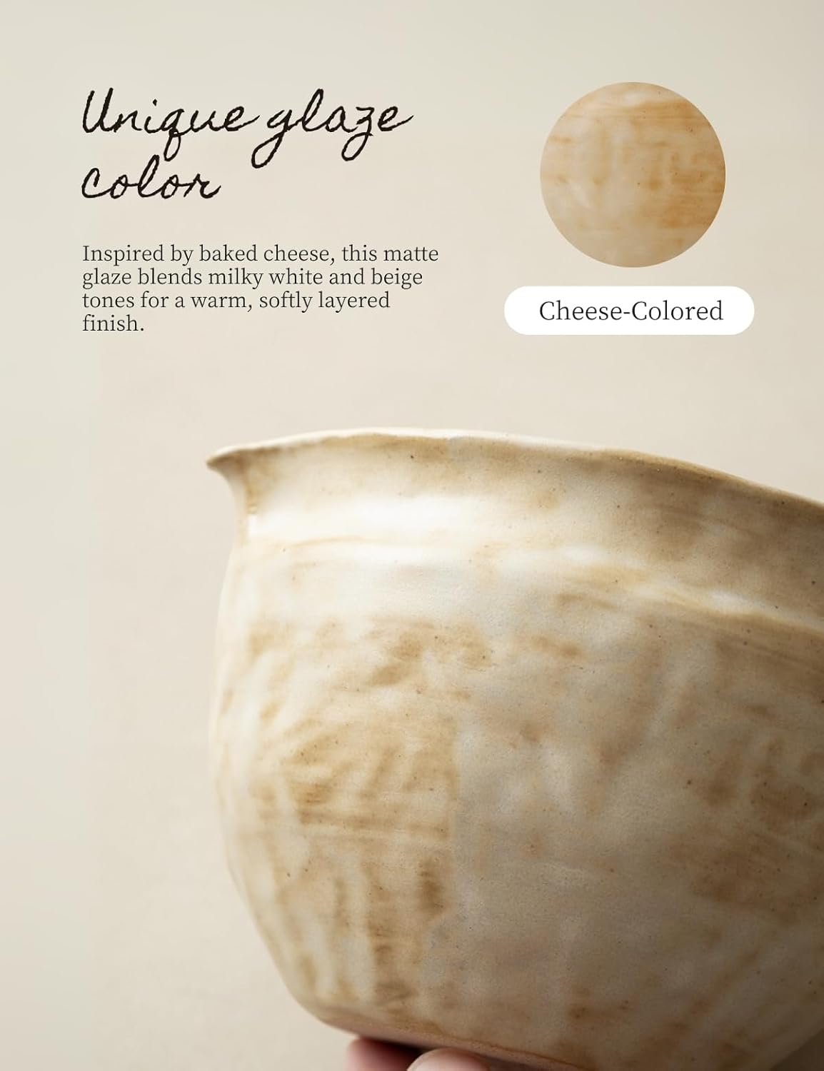 - Handcrafted Wabi-Sabi Bowl with Cheese-Colored: Hand-shaped with natural thickness variations, then brush-glazed stroke by stroke. Each product is unique. High-temperature fired , food-safe, microwave-safe, and dishwasher-safe.Cheese-colored is inspired by the dense and slightly melted wrinkles of cheese after baking. The warm cheese color adds a touch of rustic calm to the ceramic.