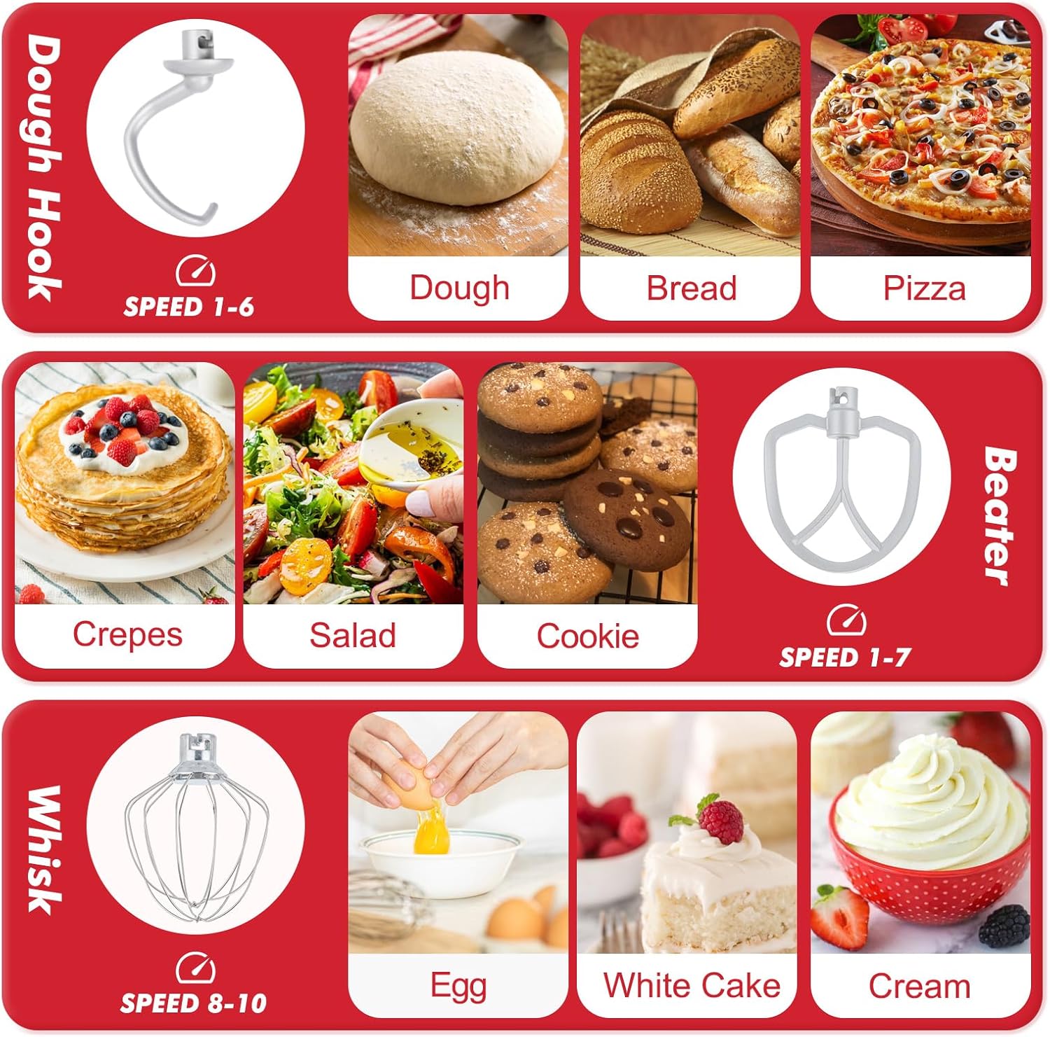 - 【Durable Attachments & Dishwasher Safe】As a versatile food mixer it includes coated aluminum dough hooks & beaters, plus a stainless steel whisk for lasting performance. All attachments snap on and off in seconds for quick changes during baking. The stainless steel bowl and all attachments are dishwasher safe (top rack recommended), ensuring quick and hassle-free cleanup.