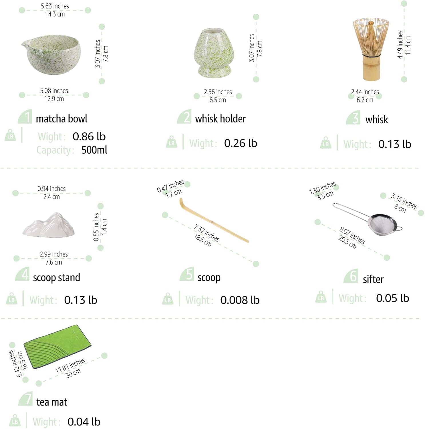- Complete Set Contents: Includes ceramic bowl (chawan), bamboo whisk, bamboo scoop (chashaku), ceramic whisk holder, ceramic scoop stand, cotton tea cloth (chakin), and matcha powder sifter