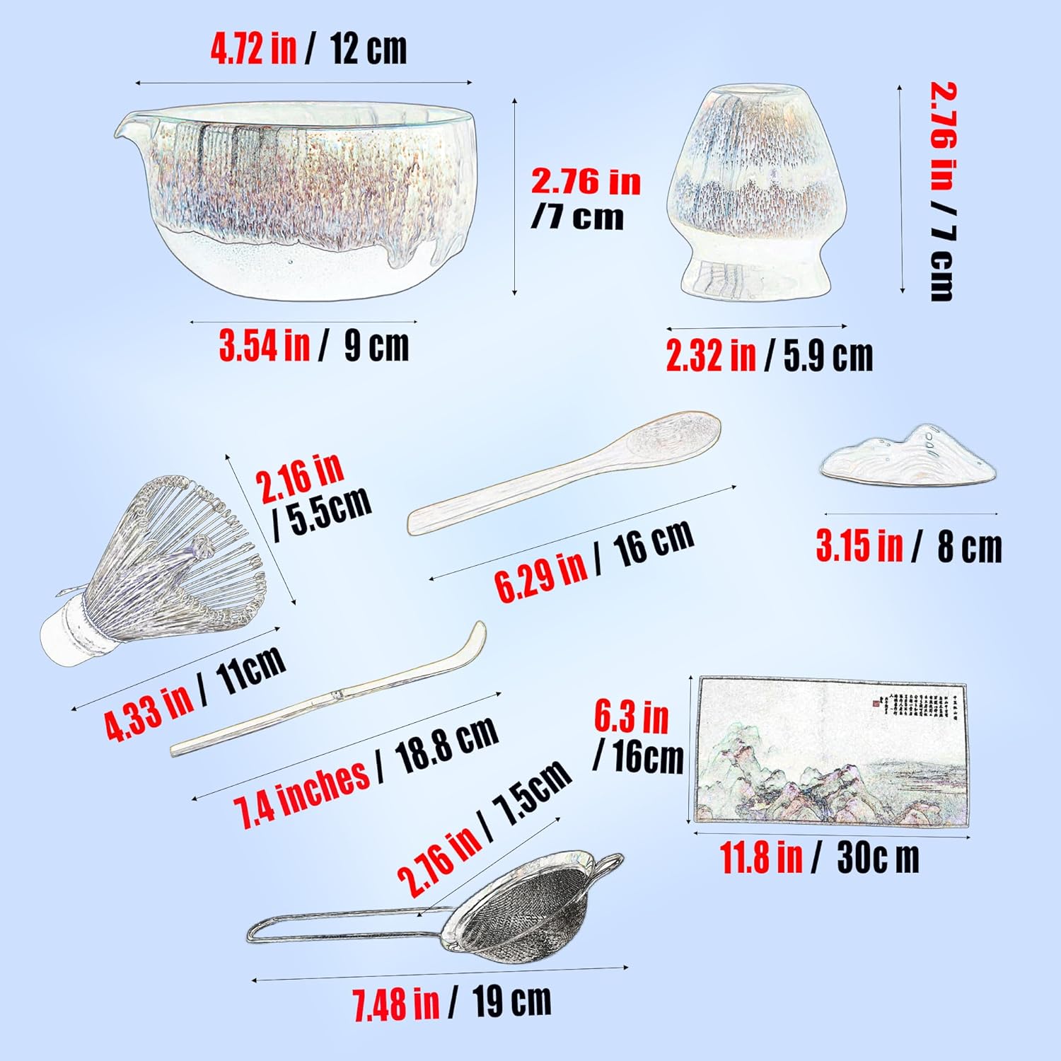 - 【8-Piece Complete Matcha Preparation Set】 This kit includes all core accessories: ceramic bowl (chawan), bamboo whisk (chasen), bamboo scoop (chashaku), bamboo spoon, ceramic whisk holder, ceramic scoop stand, cotton tea cloth (chakin), and matcha powder sifter. Designed as a ready-to-use solution for traditional matcha making.