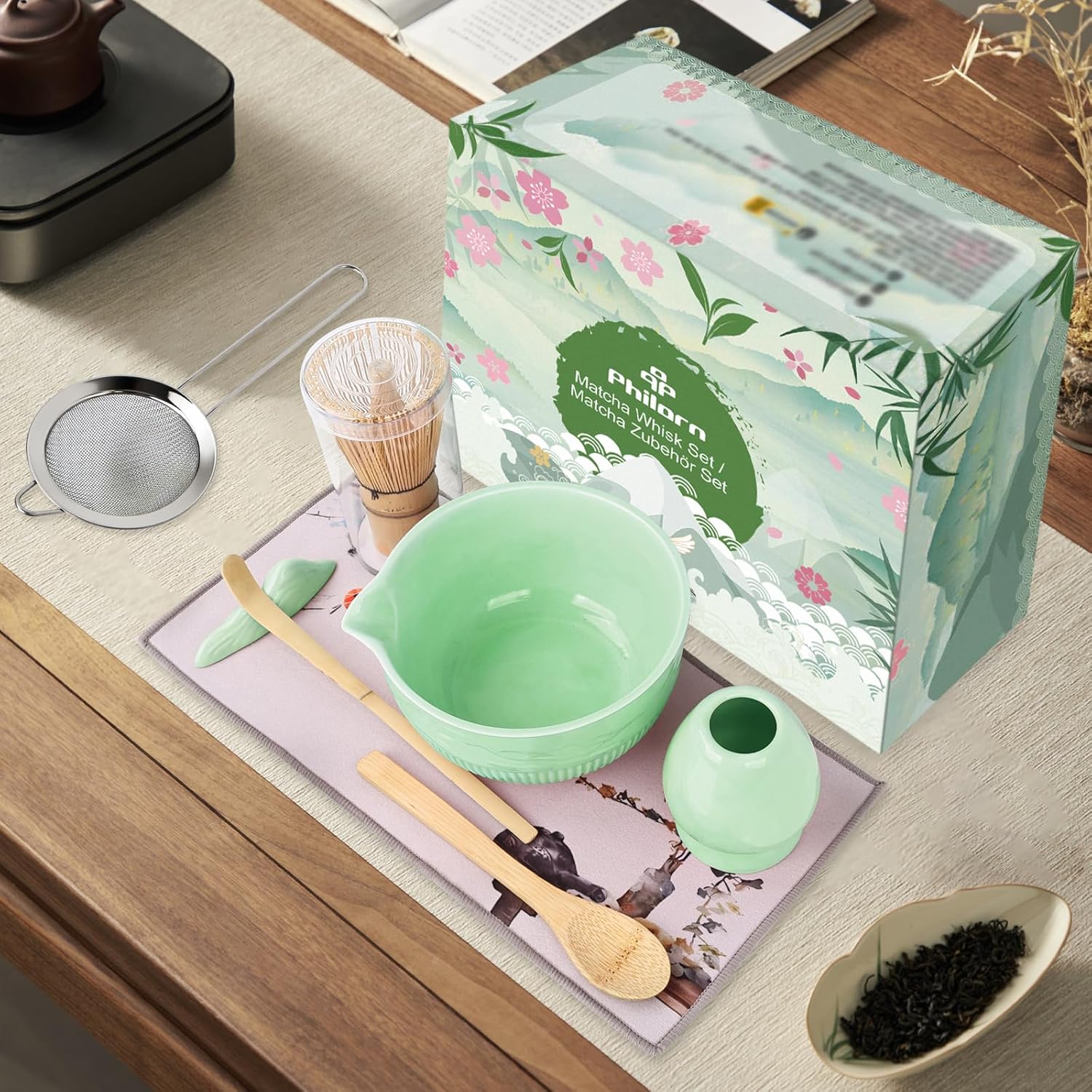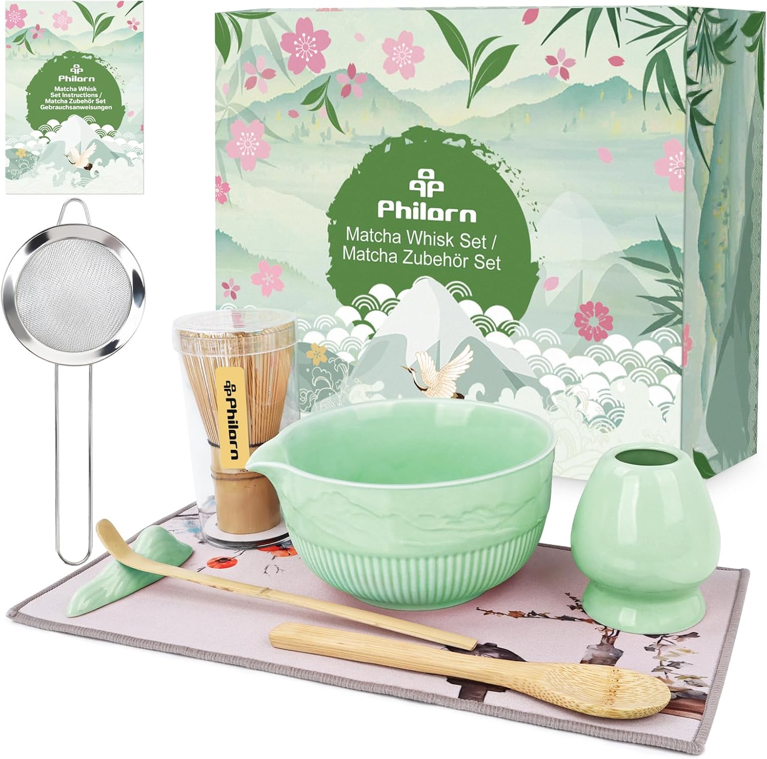 - Complete Matcha Set: This matcha kit includes 9Pcs essentials tools for an authentic matcha experience: 1 bamboo matcha whisk, 2 bamboo spoons, 1 spoon stand, 1 stainless steel sifter, 1 ceramic matcha bowl, 1 whisk holder, 1 tea towel, 1 Hand book. This matcha set covers all the necessary steps for making matcha, enjoy a more pleasant matcha time.
