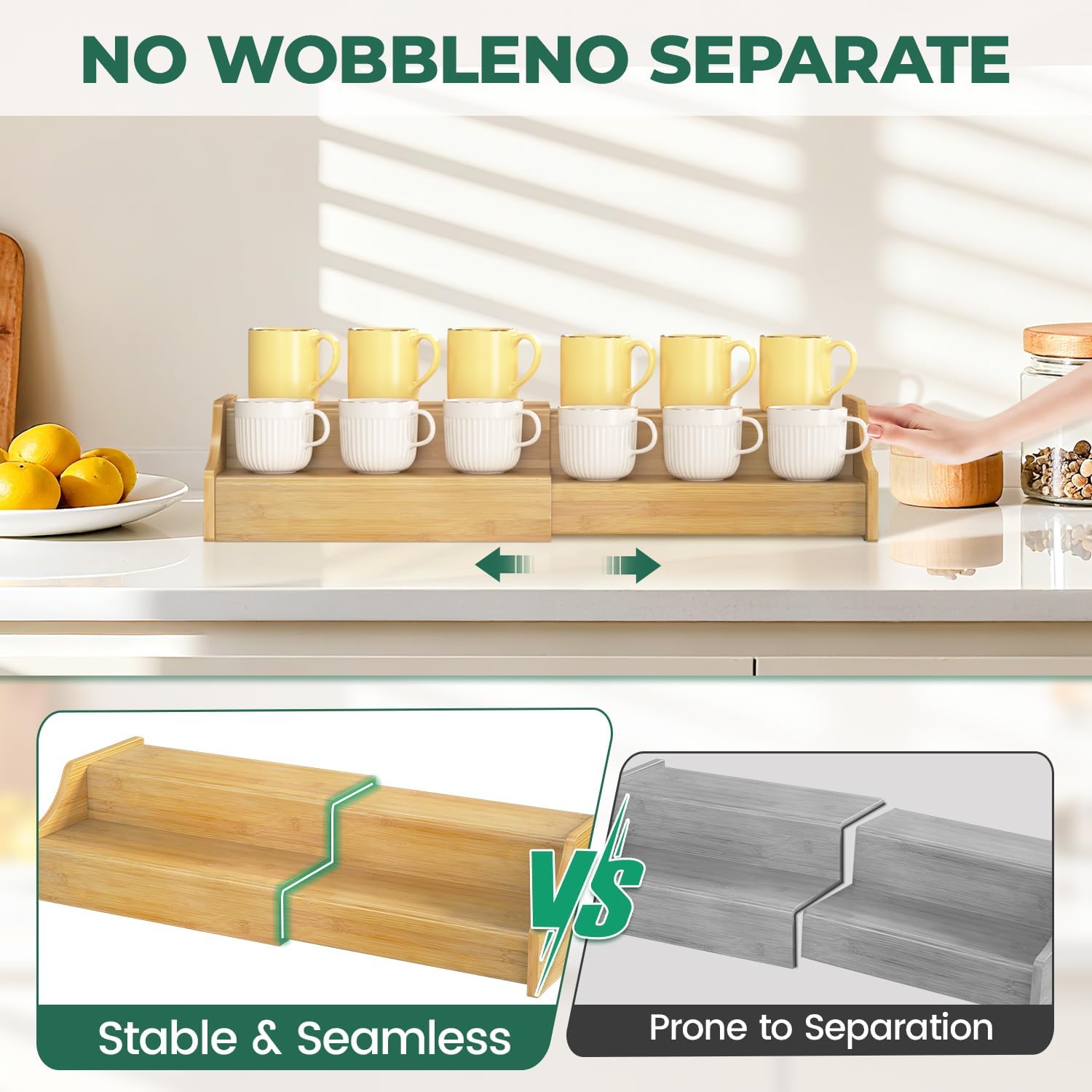 - Expandable Design & Secure Stability: This bamboo mug rack smoothly expands from 15.9'' to 29.1'', adapting perfectly to different cabinet widths or countertop spaces. Unlike ordinary racks, both sides stay firmly connected even when fully extended, so the structure never separates. Enjoy flexible adjustment with steady, clutter-free organization for kitchens, coffee bars, or offices
