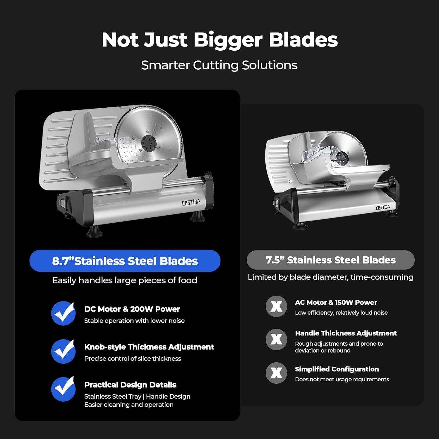 OSTBA Electric Meat Slicer with 200W DC Motor, 2 Removable 8.7” Stainless Steel Blades, Adjustable Thickness 0–15mm, Food Tray & Hand Grip, Deli Food Slicer for Meat, Cheese, Bread, Vegetables