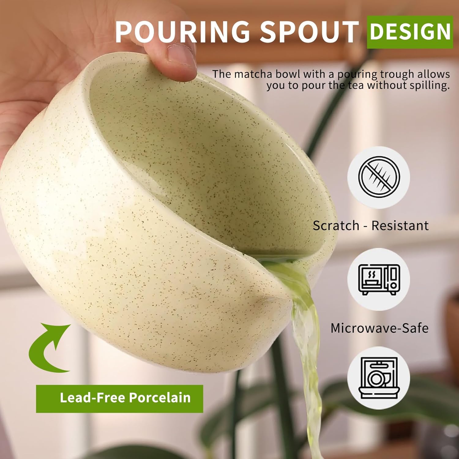 - Engineered Pouring Spout:Featuring a matcha bowl with spout for drip-free transfer to matcha tea cups, paired with a non-slip whisk holder that stabilizes during daily matcha rituals.