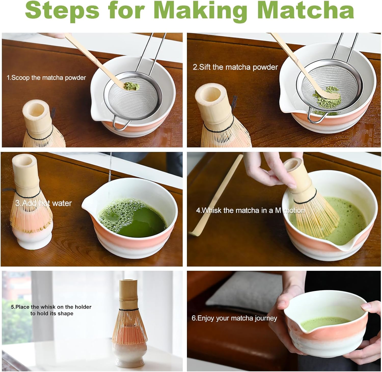 - Complete 5-Piece Matcha Kit: Includes ceramic chawan bowl with spout, handcrafted bamboo whisk, bamboo scoop, whisk holder, and stainless steel sifter for authentic matcha preparation