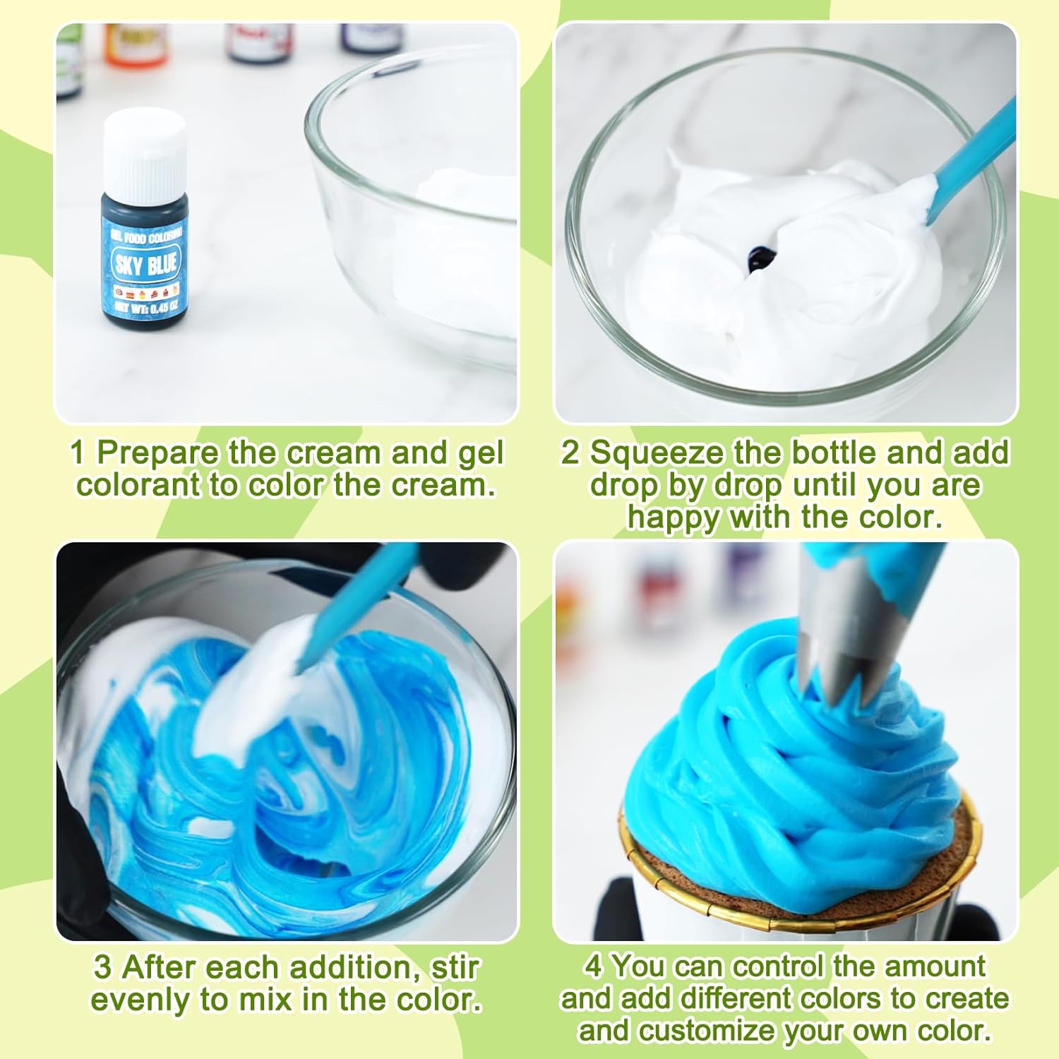 - WIDE APPLICATION - Gel food coloring is widely used in cake and cookie decorating, macarons, ice cream, fondant, royal icing, frosting, syrup drinks, whipped topping, baking and cooking, etc. It can also be widely used in Easter eggs, slime making, soap and other DIY projects.