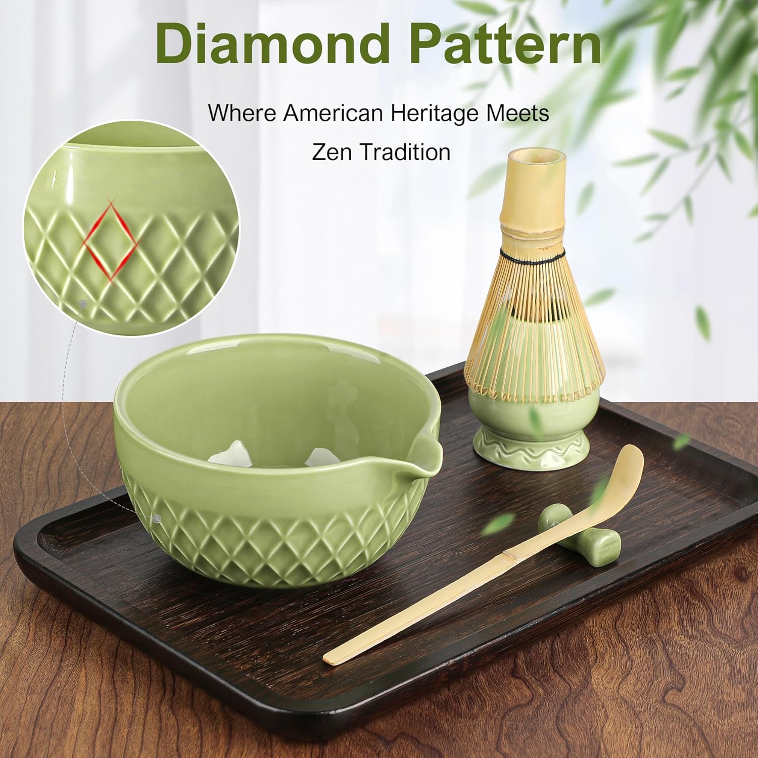 Matcha Whisk Set, 7 Pcs Matcha Kit, Ceramic Matcha Set Includes Matcha Bowl with Spout, Matcha Whisk and Holder, Bamboo Scoop, Scoop Rest, Sifter and Tea Towel (Matcha Green)