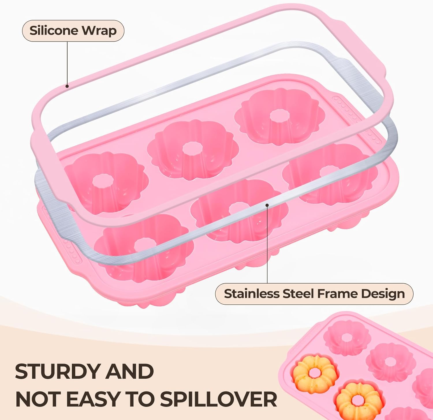 - No More Wobbly! Are you tired of mini bundt cake pans constantly morphing as you move them around? The sturdy hidden stainless steel frame of our small bundt cake pans is designed to allow you to easily transfer them to the oven without supporting the tray during use, so you never have to worry about batter spills! It saves you a lot of heartache and effort