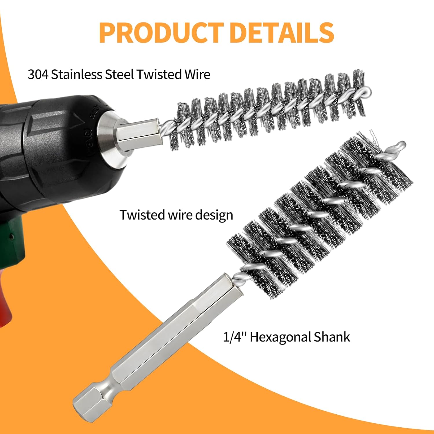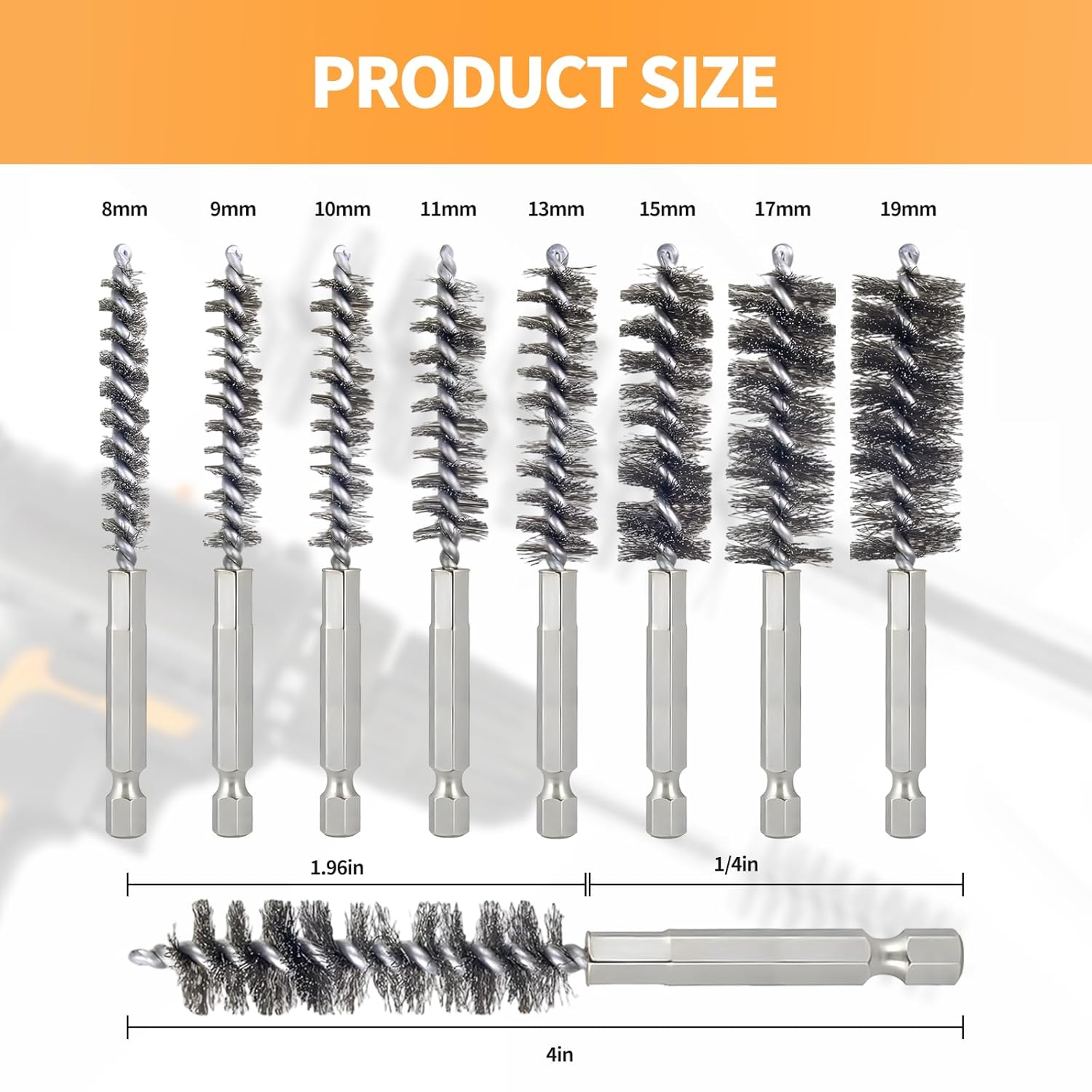 - 8 Sizes for Maximum Versatility – Includes 8 bore brushes (8mm, 9mm, 10mm, 11mm, 13mm, 15mm, 17mm, 19mm), each with a 4-inch brush length and 1/4" hex shank. Compatible with any standard drill or die grinder (not included), ideal for cleaning holes of various diameters.