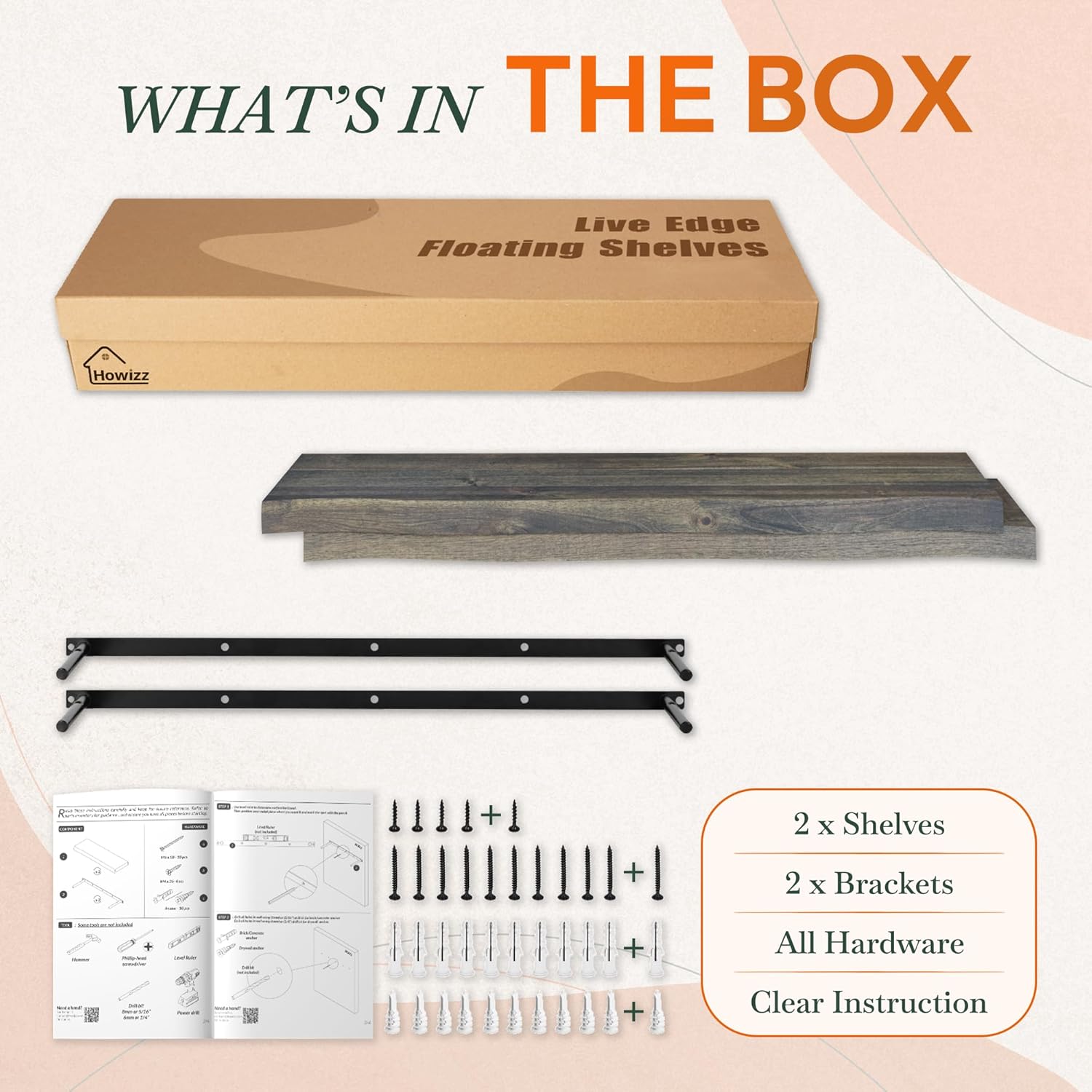 - THICK WOOD SHELF: Howizz's wall shelf is crafted from 100% acacia wood with, emphasizing its rich texture and robust durability. These live edge wood shelves will bring distinctive character to your space, offering a unique blend of vintage and modern elements.