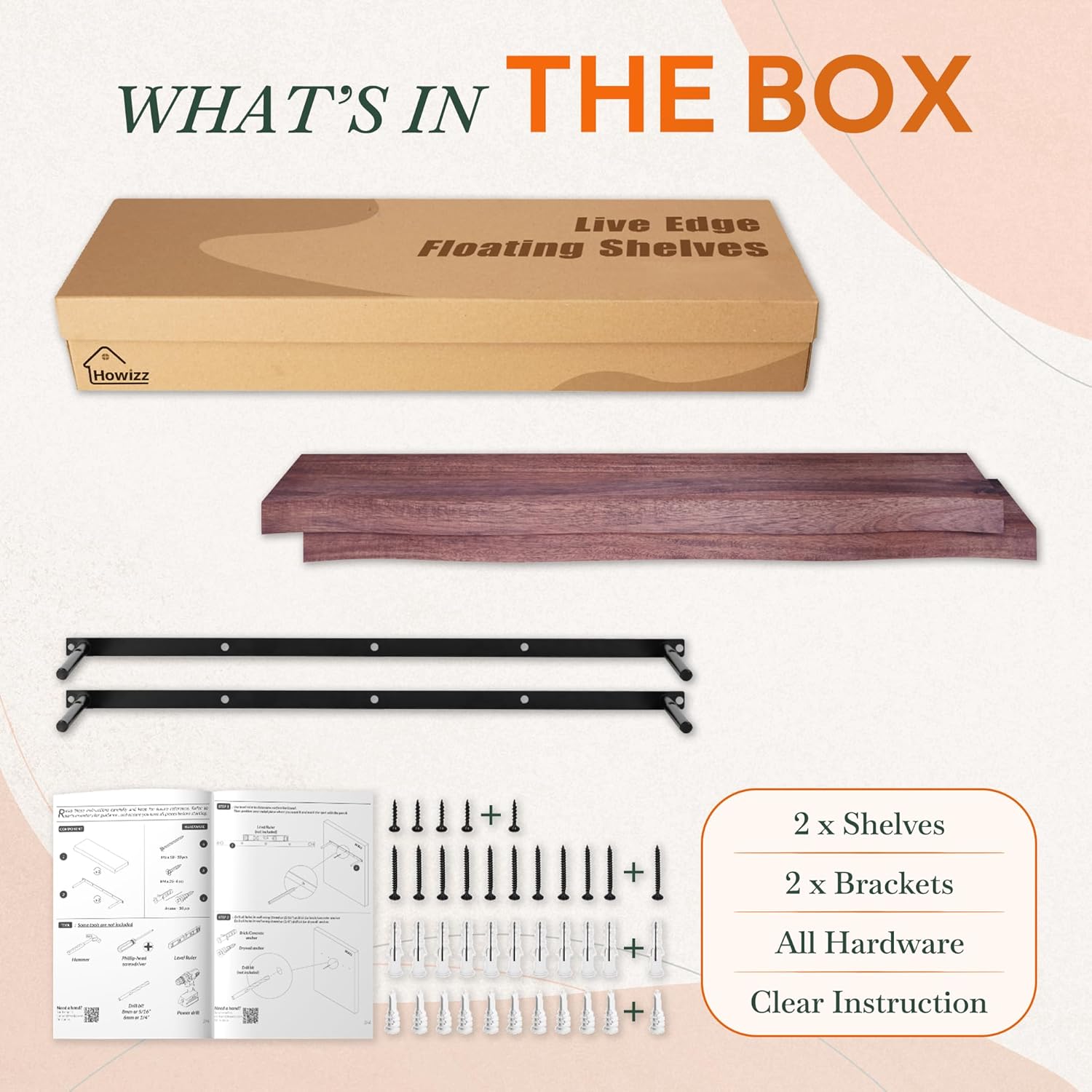 - THICK WOOD SHELF: Howizz's wall shelf is crafted from 100% acacia wood with, emphasizing its rich texture and robust durability. These live edge wood shelves will bring distinctive character to your space, offering a unique blend of vintage and modern elements.