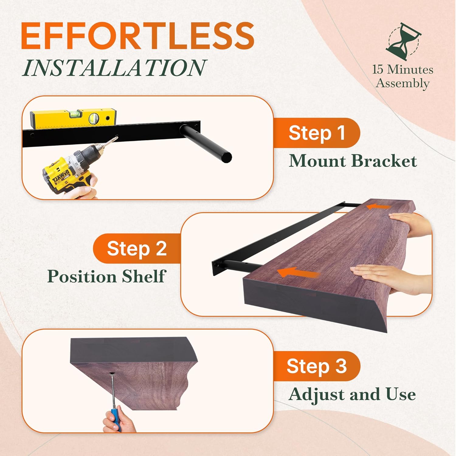 - EASY TO INSTALL: All necessary hardware is included, and each package comes with simple instructions, allowing you to complete the installation in just 15 minutes. Specially, this floating shelf can be easily arranged in various layouts, allowing you to creatively decorate your home in your own style.