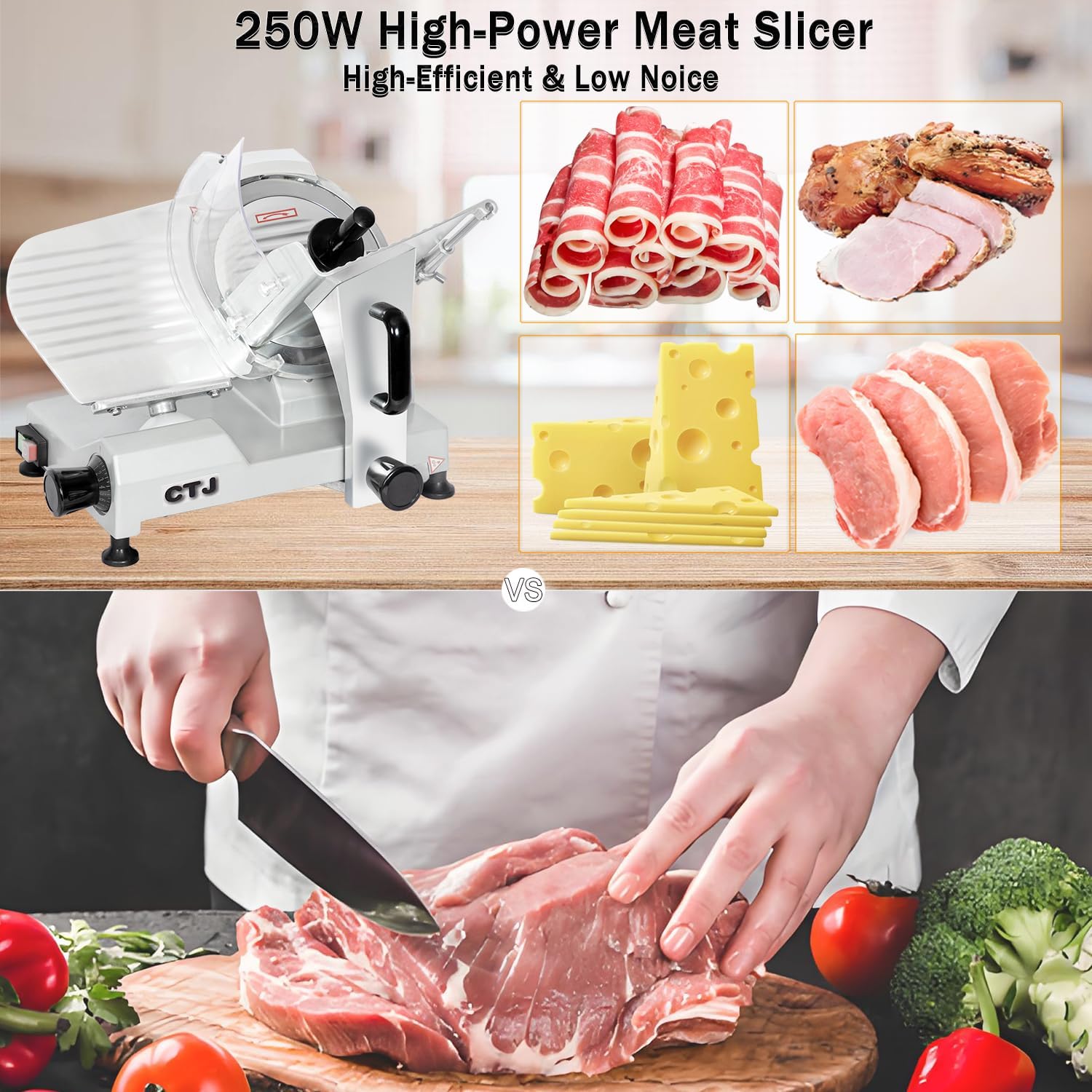 - Versatile Uses: This food slicer works for cutting a variety of ingredients, including meat, deli items, cheese, roast beef, turkey breast, bread, vegetables, and fruits. It’s suitable for both home and commercial settings—such as home kitchens, restaurants, butcher shops, and cafeterias. (Note: Frozen meat needs 15 mins of room-temp thawing. Hard cheeses, bread, veggies: slice directly. Fresh meat/soft foods, though, should be frozen first for best slicing results.)