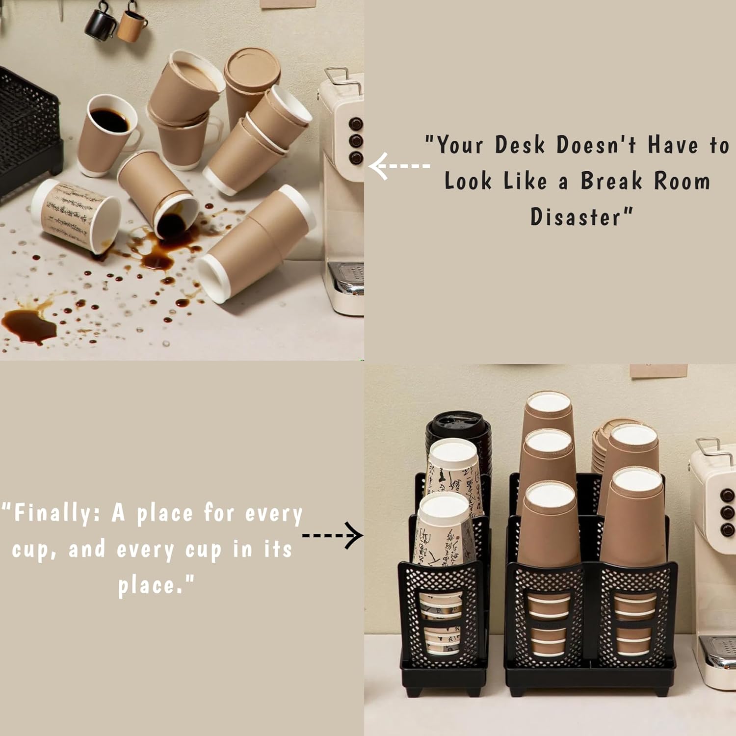 - Spacious design with dividers Vertical slots are evenly distributed to accommodate standard-sized cups,mugs,water bottles,and even small jars.The upright,flat design prevents spills and tilting,while making it easy to access drinks or tools.The base is raised to allow cups to drain quickly.
