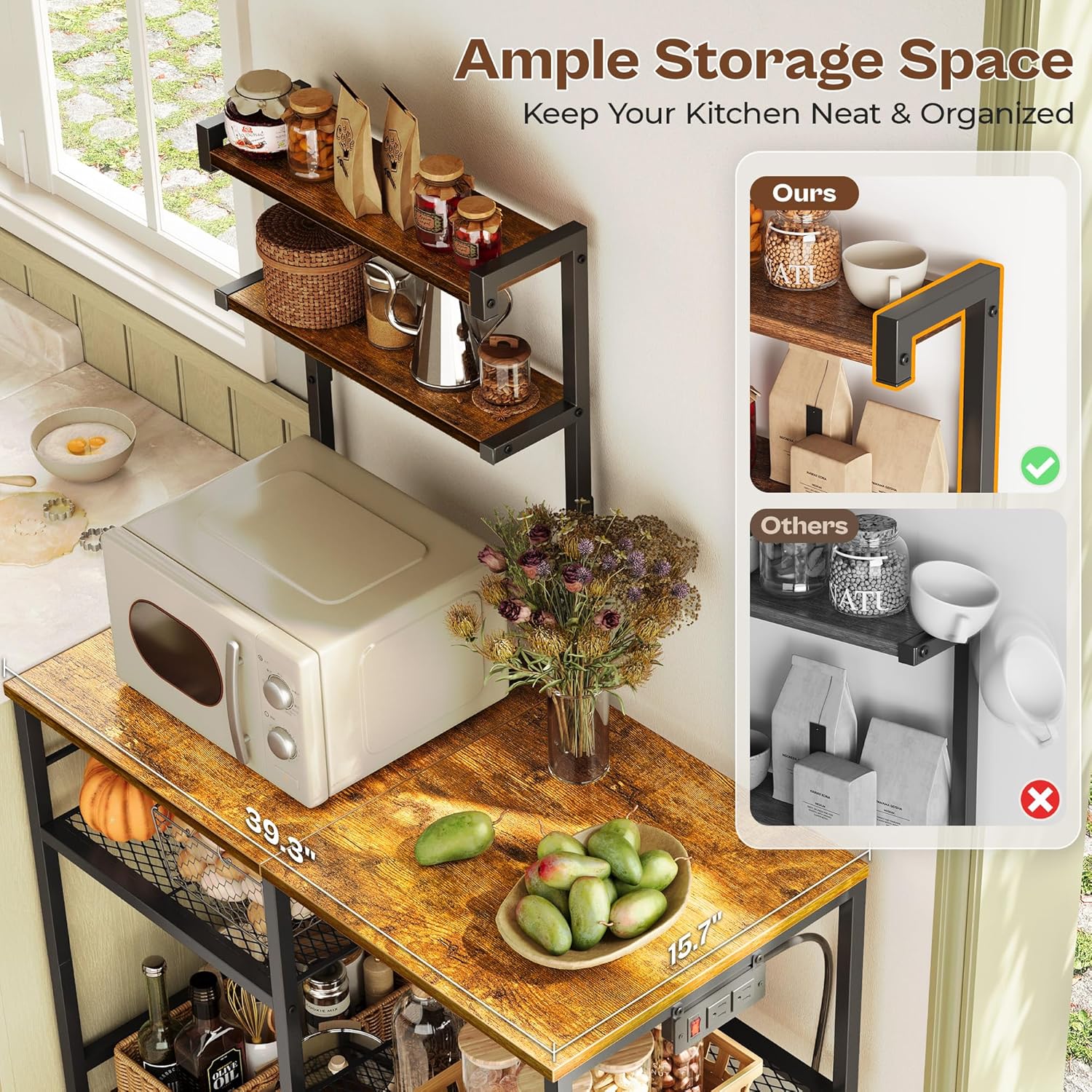 - 【Strong Desktop Support & Spacious Countertop】This desktop of the kitchen bakers rack is built stronger! Its wide, sturdy surface easily fits your microwave, air fryer, or coffee machine — giving you a solid station that doubles your counter space. Finally, everything has a spot — and this kitchen stand looks amazing, too