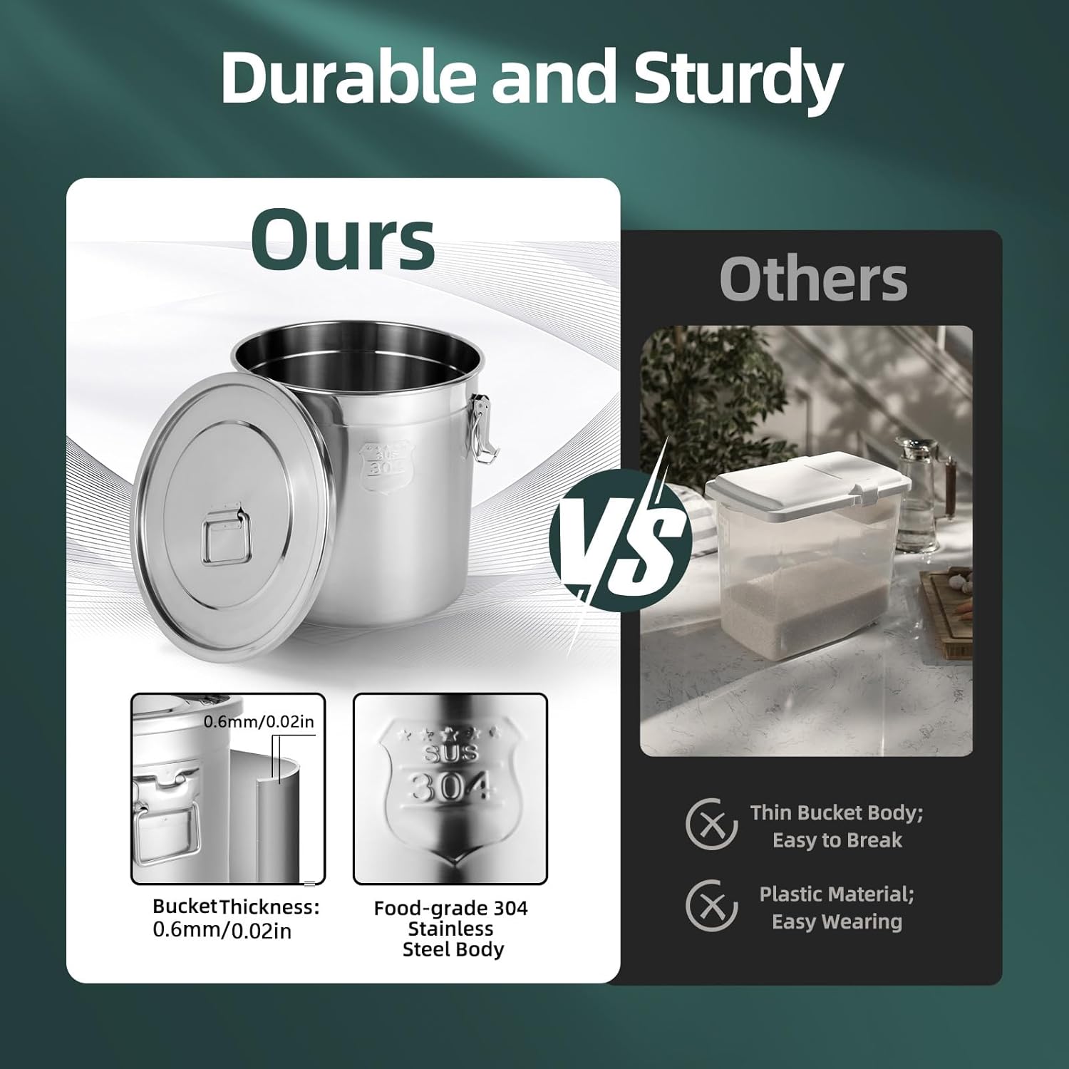 - Durable and Sturdy: The storage bucket has a food-grade 304 stainless steel body with a thickness of 0.6mm and a polishing process, 201 stainless steel sealing buckles and handles with butt welding, and a high-quality silicon sealing ring, offering durability and sturdiness for this airtight food storage container