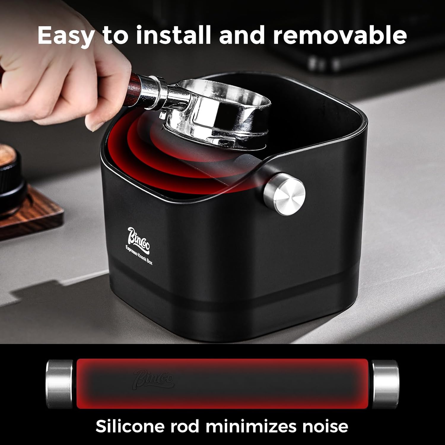 - Detachable Noise-Reducing Silicone Knock Bar – Soft silicone absorbs impact, protects your portafilter, and can be removed for easy cleaning.