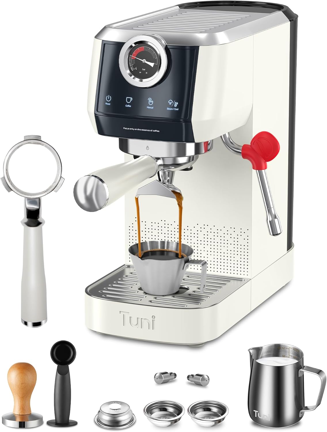 - [𝗗𝘂𝗮𝗹 𝗛𝗲𝗮𝘁𝗶𝗻𝗴 𝗦𝘆𝘀𝘁𝗲𝗺 & 𝟮𝟬-𝗕𝗮𝗿 𝗛𝗶𝗴𝗵 𝗣𝗿𝗲𝘀𝘀𝘂𝗿𝗲] - The Tuni semi-automatic espresso machine heats up in just 30 seconds and extracts rich crema, letting you enjoy a delicious espresso quickly. It features an original Italian 20-bar ULKA water pump and a built-in visual pressure gauge, with precise temperature control via PID + NTC to ensure full extraction of flavor and oils, resulting in a rich and aromatic espresso.