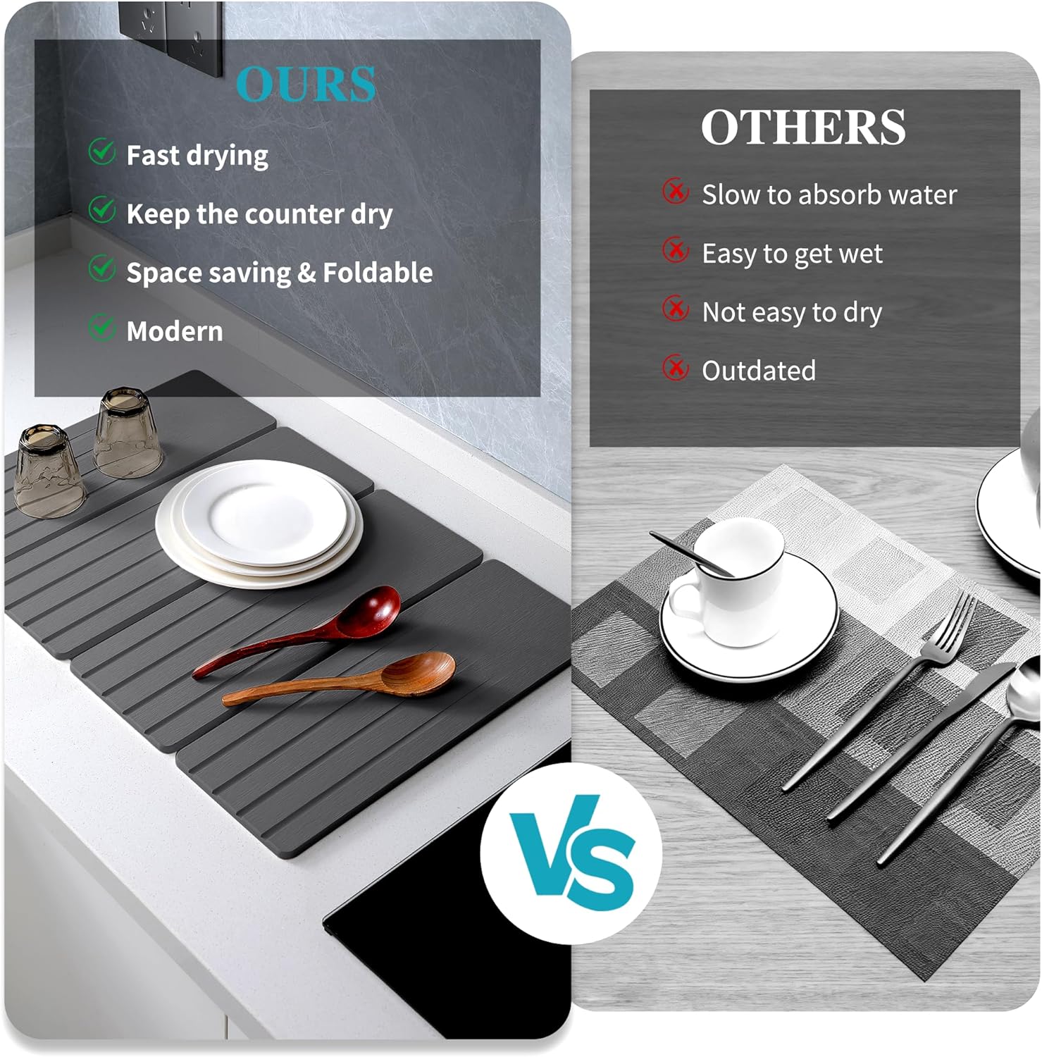 - Collapsible and Space-Saving: Measuring 23.62x15.35'' when unfolded, this collapsible stone drying mat offers ample space for your dishes. When not in use, easily store it in drawers or kitchen cabinets, maximizing your kitchen's organization